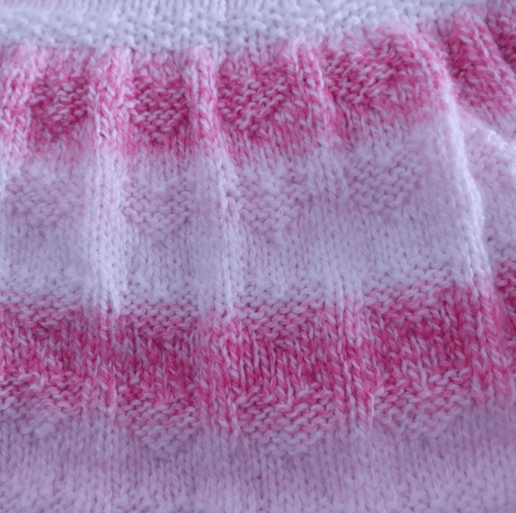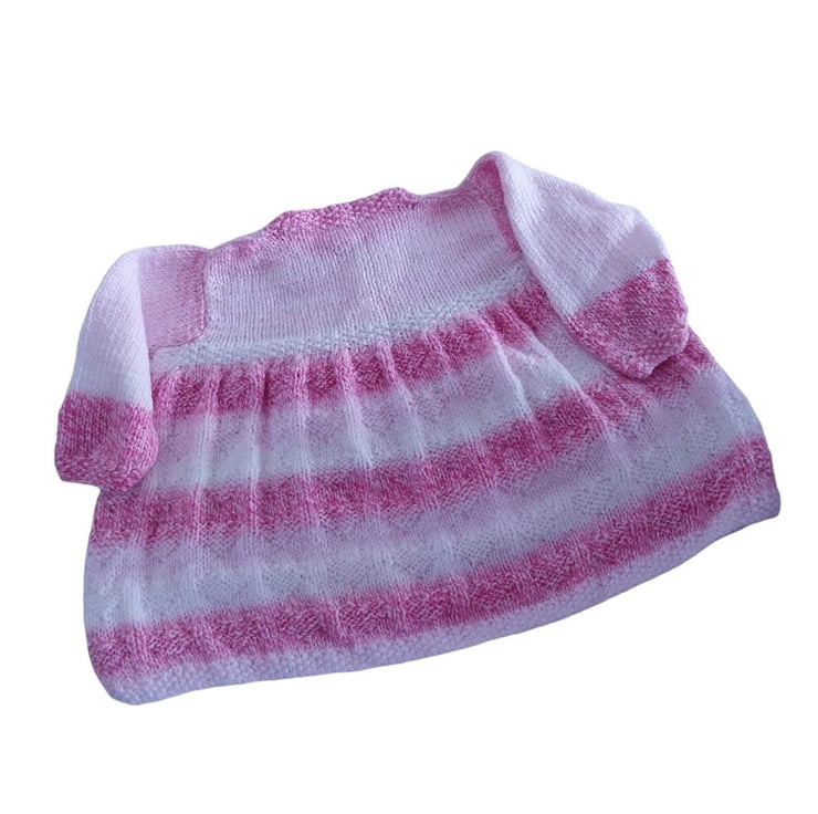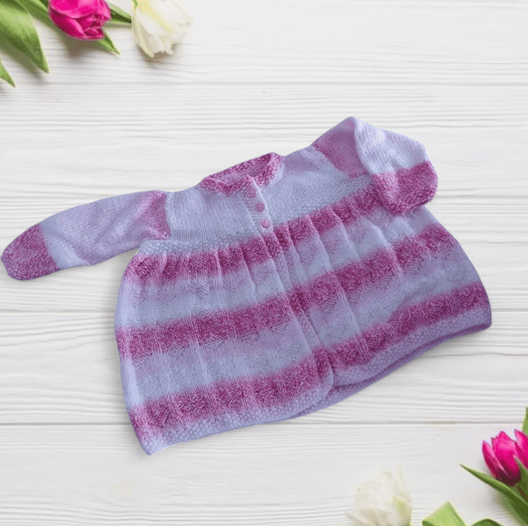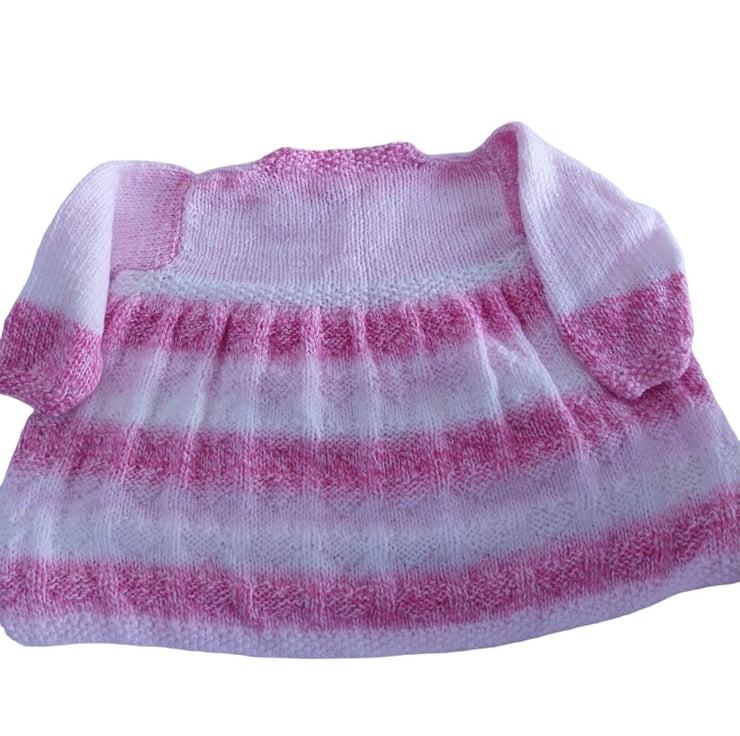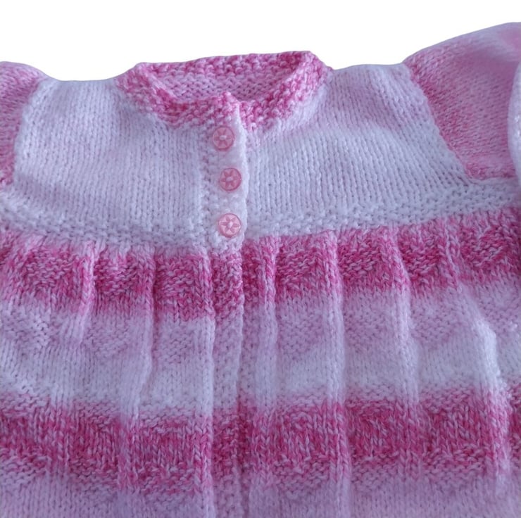 This sweet hand-knitted baby cardigan combines soft pinks and whites with a charming textured heart pattern. Designed for babies aged 3 to 6 months, it's not only adorable but also wonderfully cosy, making it perfect for keeping your little one warm and comfy.