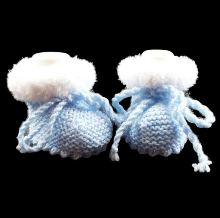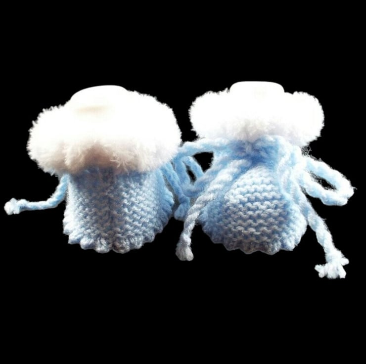 These darling booties are crafted with care, knitted in a soft and soothing baby blue yarn, perfect for your baby boy's delicate feet. The adorable white faux fur cuffs add a playful and luxurious touch, ensuring that those tiny toes stay warm and comfy.