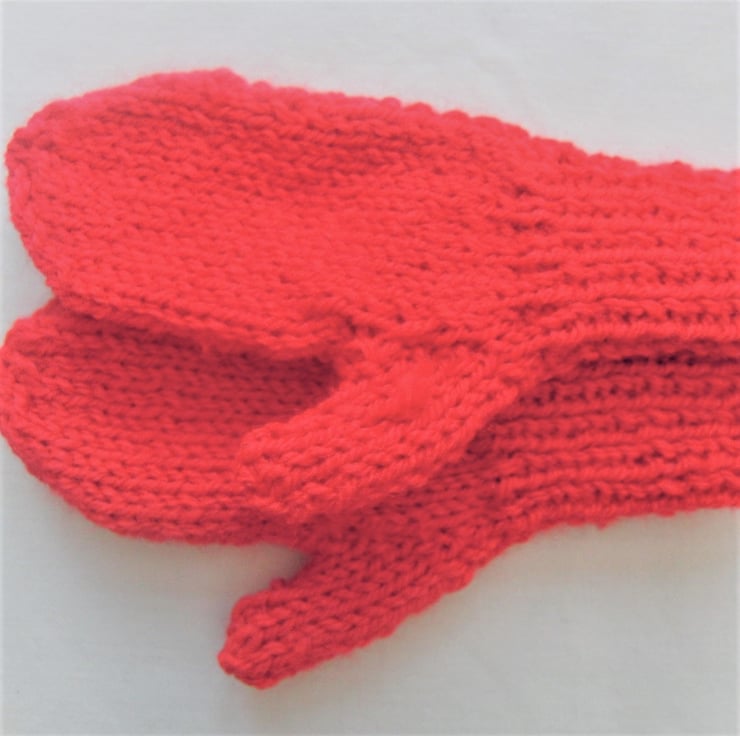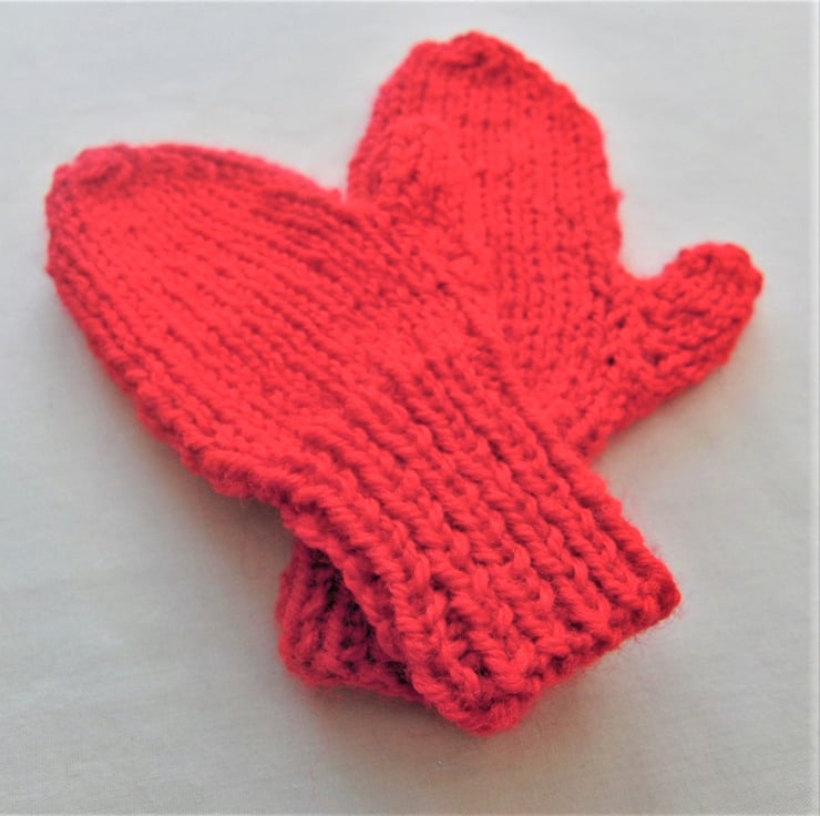 Pillar box red children's mittens hand knitted in double knitting yarn. This pair is to fit a child approximately 2 - 3 years old, 2.75 inches across the palm, but they can be made in any of the sizes shown below and in a colour of your choice.