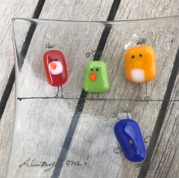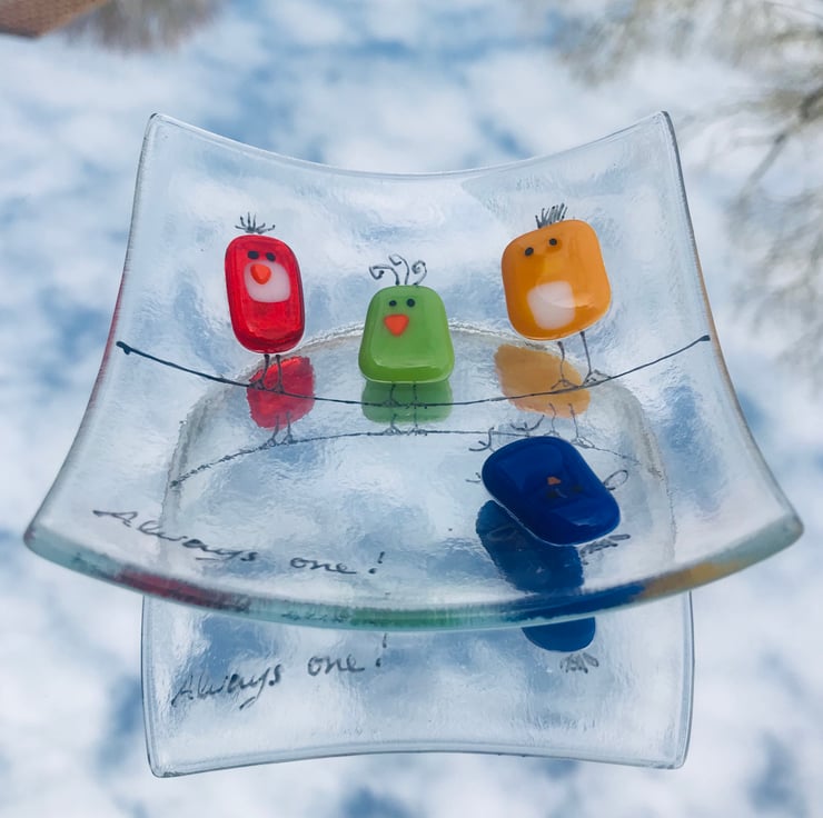 My “always one “ designed fused glass dishes and pictures are popular as they are both functional and fun . Approximately 5 inch square with a round bottom and gentle arching sides . This unique dish will bring a smile to your face . The idem will be delivered in a box wrapped well in bubble wrap and tissue paper