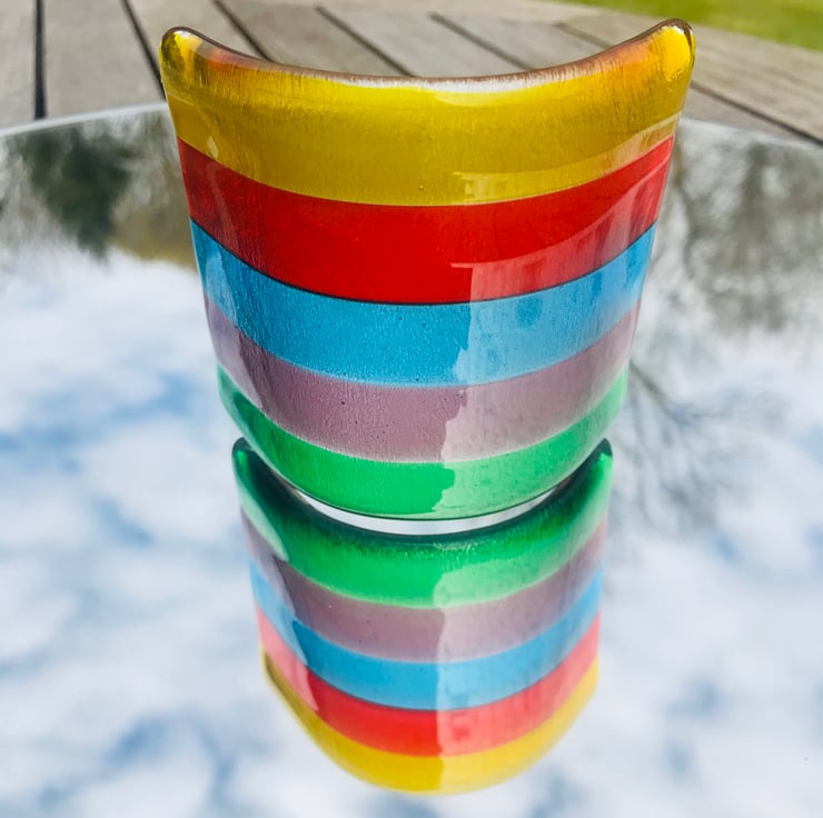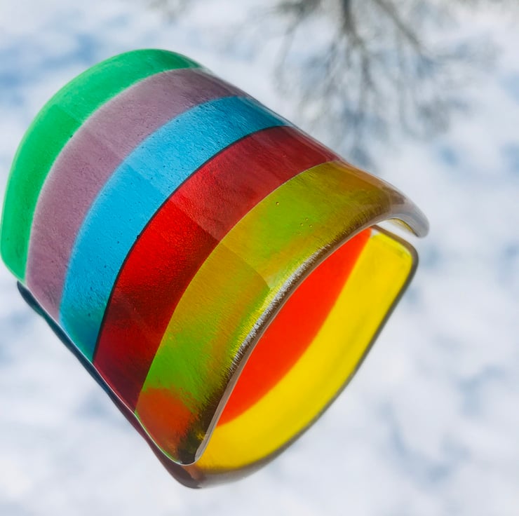 Approximately 4 inches these fused glass rainbows can stand either as a rainbow arch or as a screen for candles . They cash a beautiful rainbow shadow around your room .