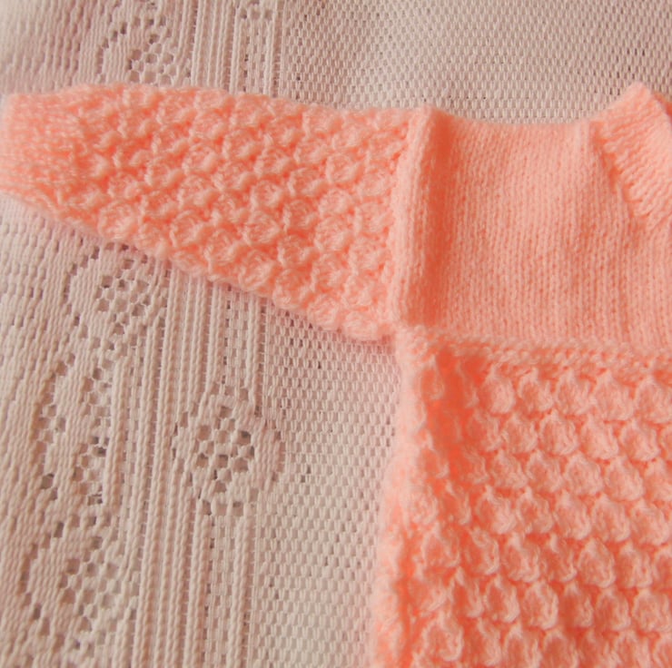 Beautiful long sleeved shell patterned dress for a baby girl hand knitted in 4-Ply yarn. It is available in sizes to fit a baby girl from premature up to 12 months.