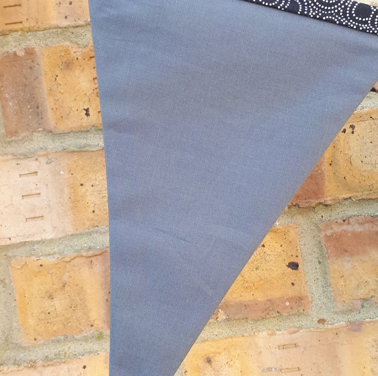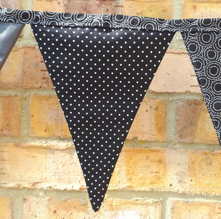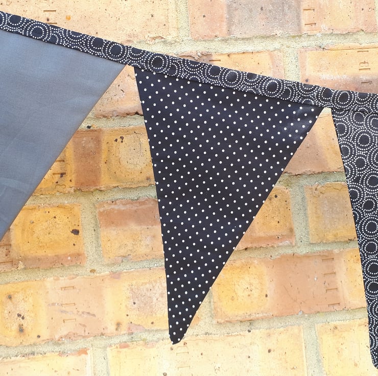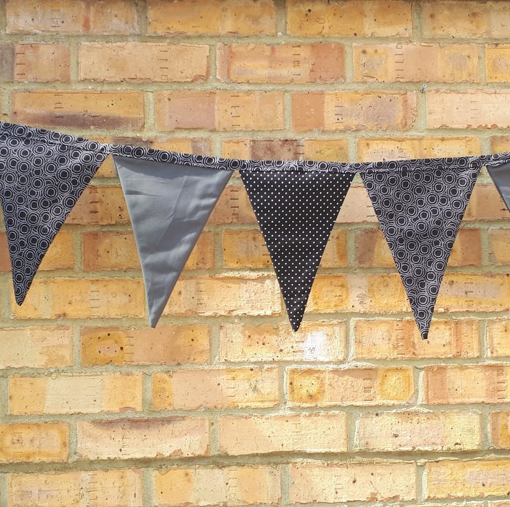 Bunting made using black and white polkadot, black and white circles and grey fabric.