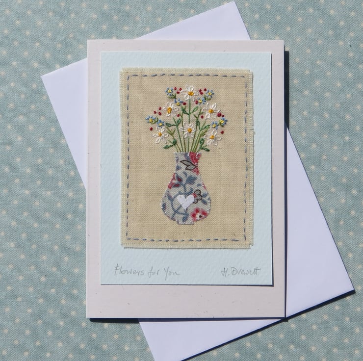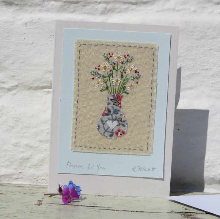I love to sit with a needle and fine colourful threads and just stitch straight onto the cloth and see what emerges! These little flowers were made that way and when complete I added a little applique vase for them with tiny heart. This greeting card could be a gift in itself to keep and frame, as well as a card in which to write your message.