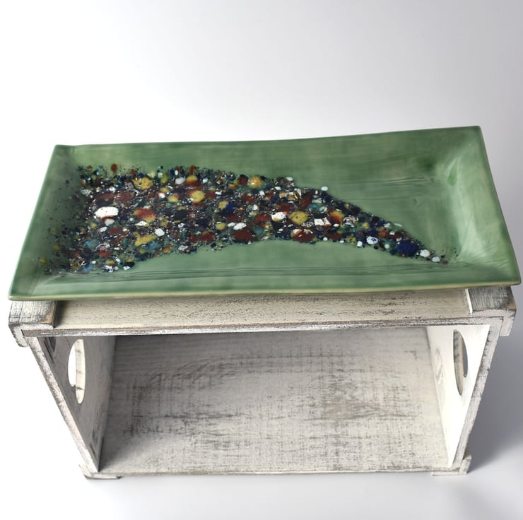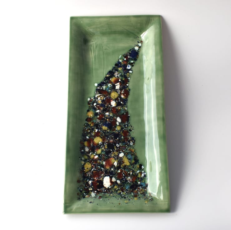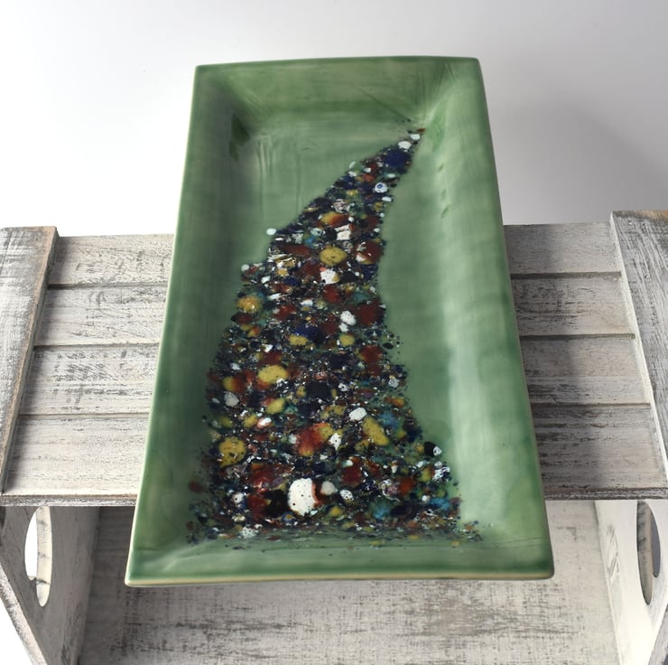 A green hand made tray/dish with a colourful design created from chips of glaze and measuring 32cm by 15cm. The pattern has a textured feel to its surface and although not intentional it puts me in mind of a Christmas tree.