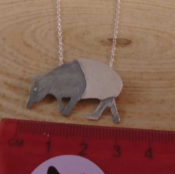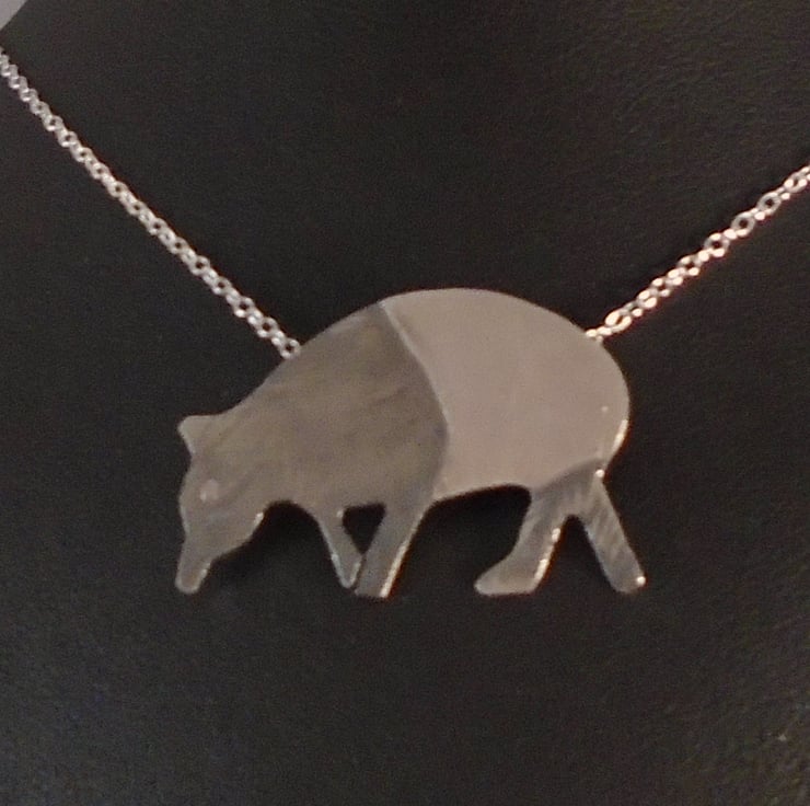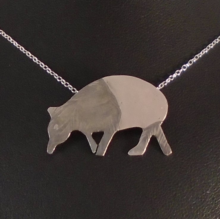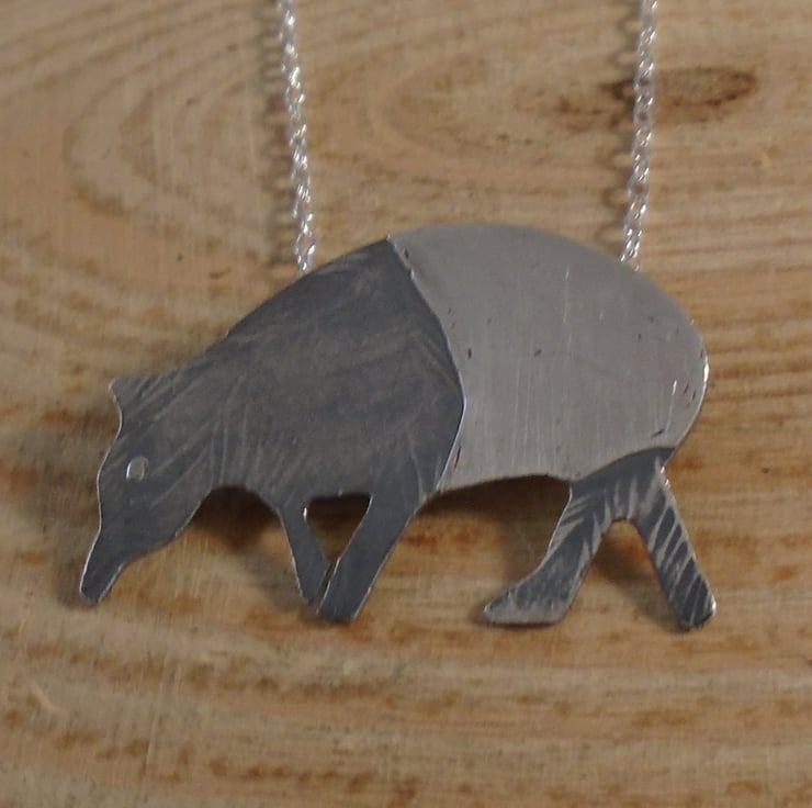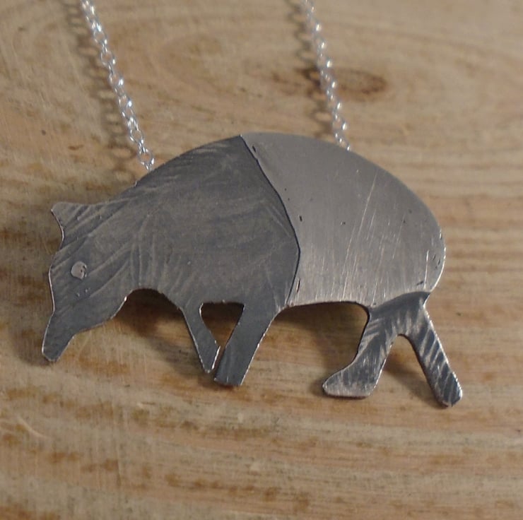 An unusual tapir necklace, hand made from sterling silver. The shape of the tapir has been hand pierced from a sheet of sterling silver. It has then been hand drawn and etched with the details. Two loops have been soldered to the back for the chain, and the necklace has been oxidised to blacken the etched details.