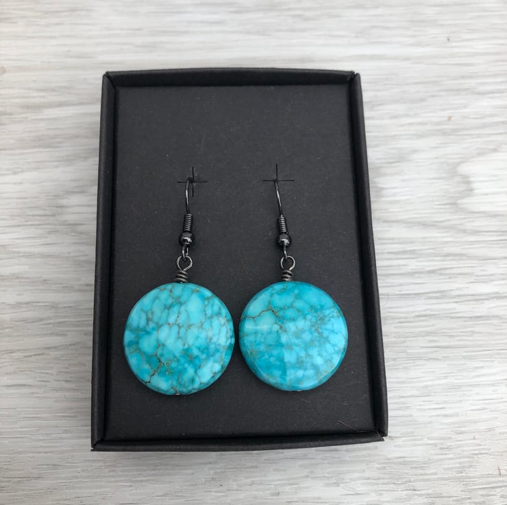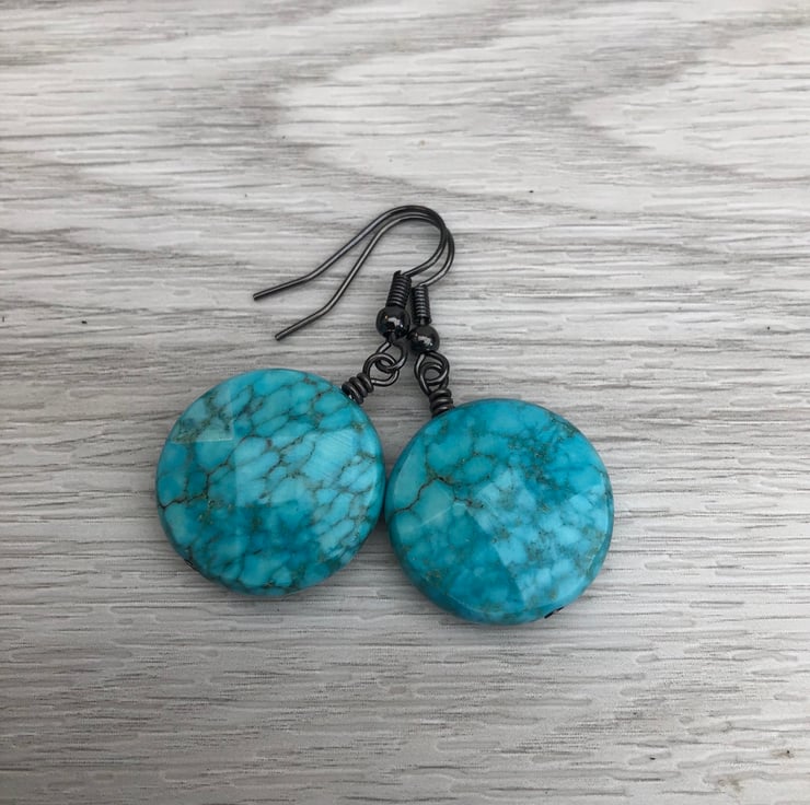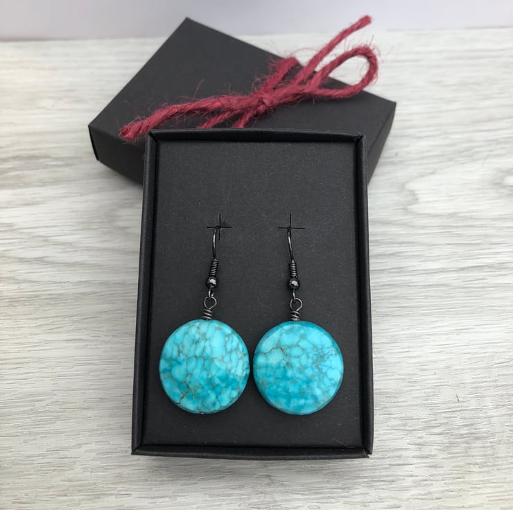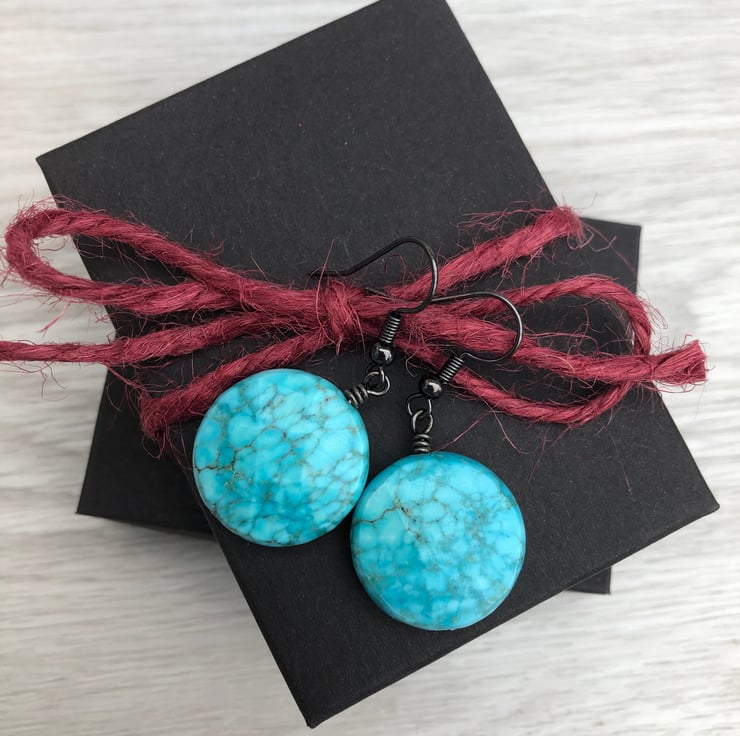 These 20mm turquoise disc beads have been simply hand wired onto antique black brass headpins and hung from matching earrings. Please note that each turquoise bead has unique markings the pair you will receive will differ in pattern to that photographed, but will be equally as beautiful,