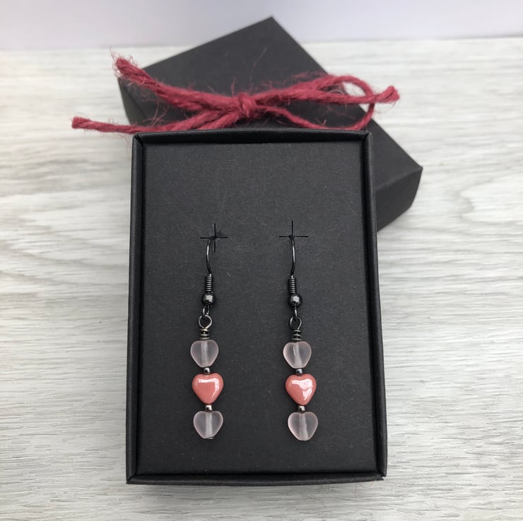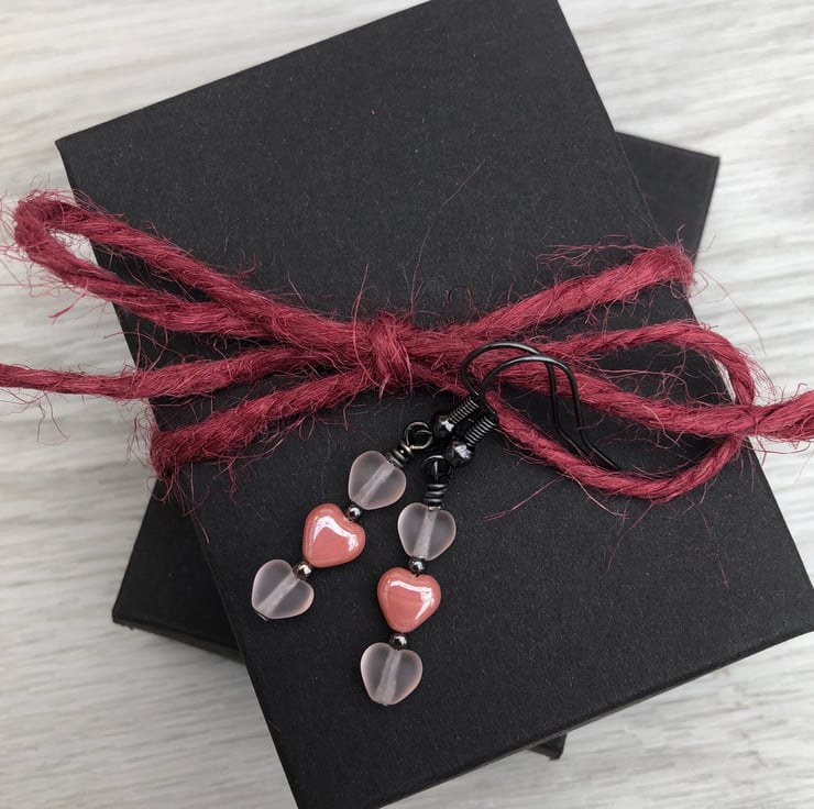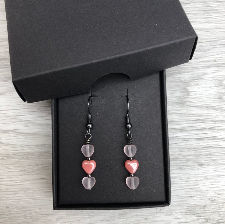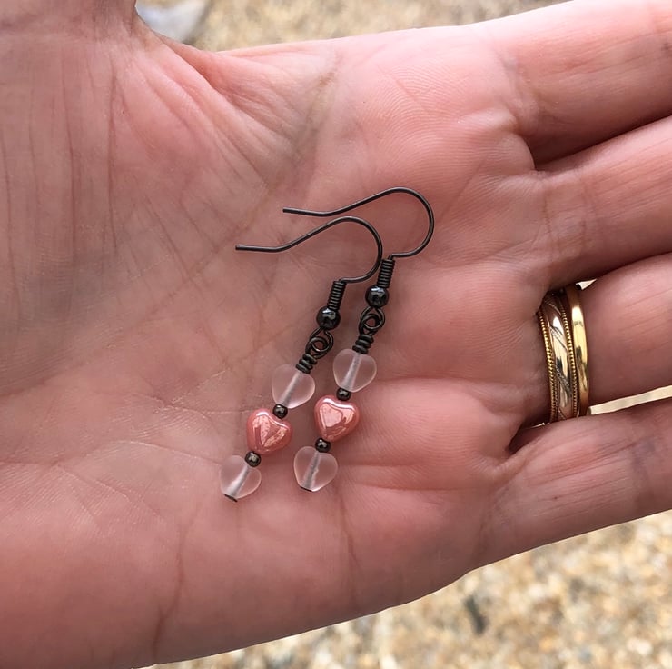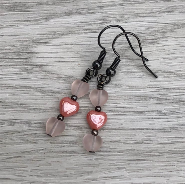 Tiny pink Czech glass hearts, approximately 6mm in size have been simply divided with antique black brass beads, hand wired onto black brass headpins and hung from matching earrings.