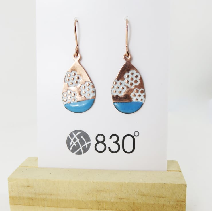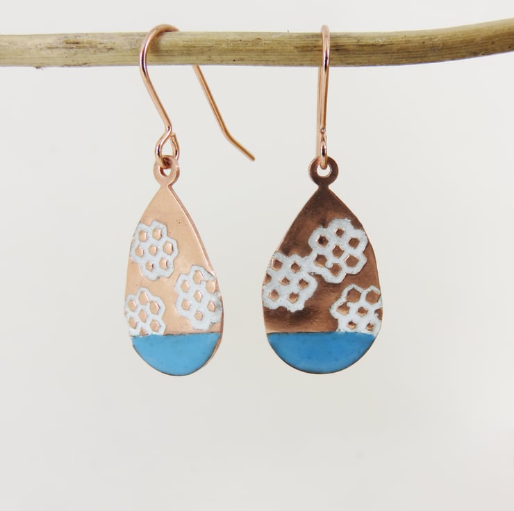 25mm x 12mm teardrop copper dangle earrings decorated with texture and the bottoms covered in turquoise enamel. Hung on rose gold plated earring hooks for pierced ears. Fired in the kiln at 830 degrees.