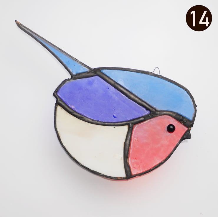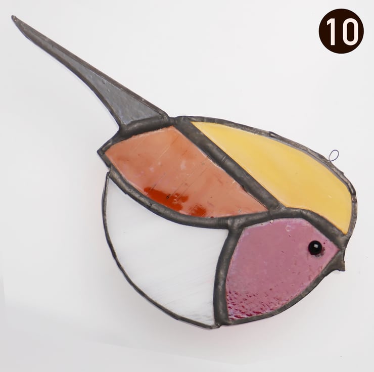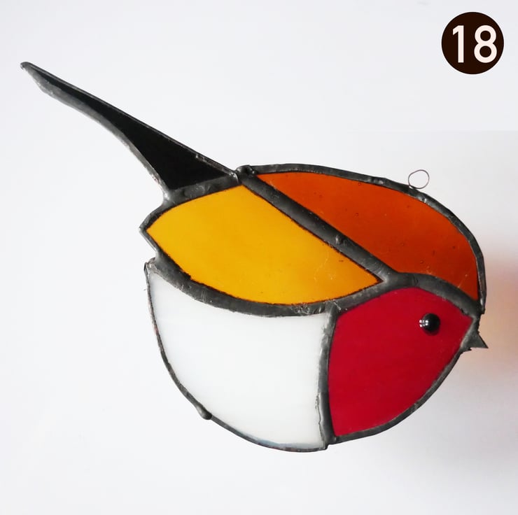 Each robin is approximately 13cm long, and made in the tiffany style (cut glass, edged in foil and soldered) before the solder is finished in black patina to give a traditional stained glass effect.