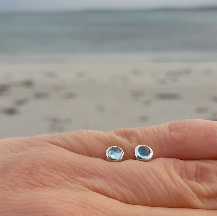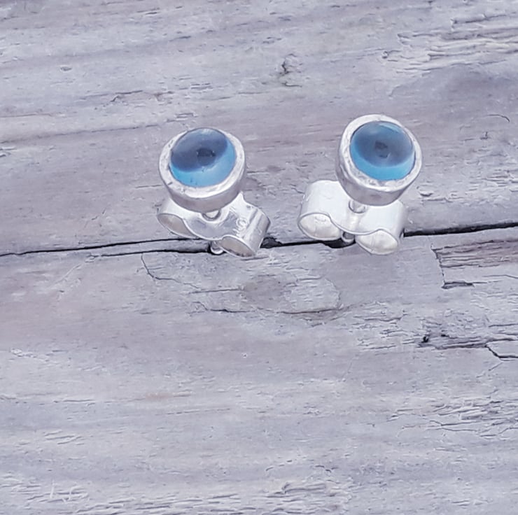 Dainty Sterling Silver Gem stone studs with 4 mm Blue Topaz Cabochons.