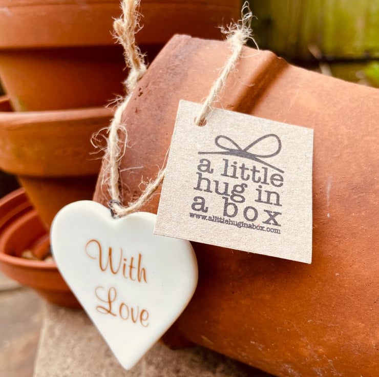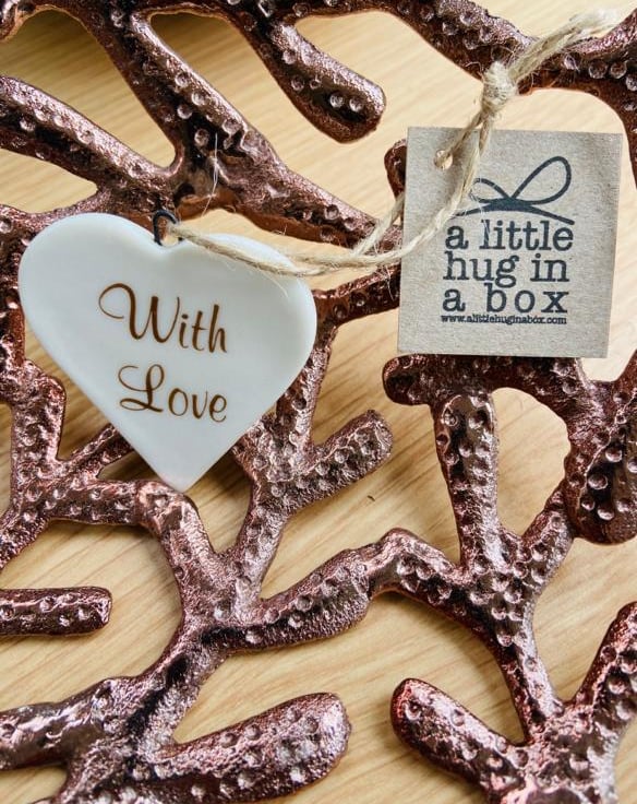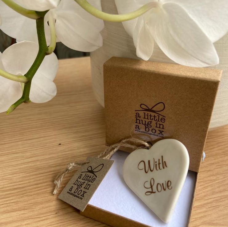 The little hug in a box range from Funky Zebra is a range of small thoughtful gifts for you to send in the post to let someone who you can't be with at the moment know that you are thinking of them. Each of these hearts is handmade in white porcelain with a gold coloured message "With Love" on the front and measures approximately 5cm x 5cm. All of the little hug in a box gifts are only £10.00 each including gift packaging as shown and postage to your chosen UK address.