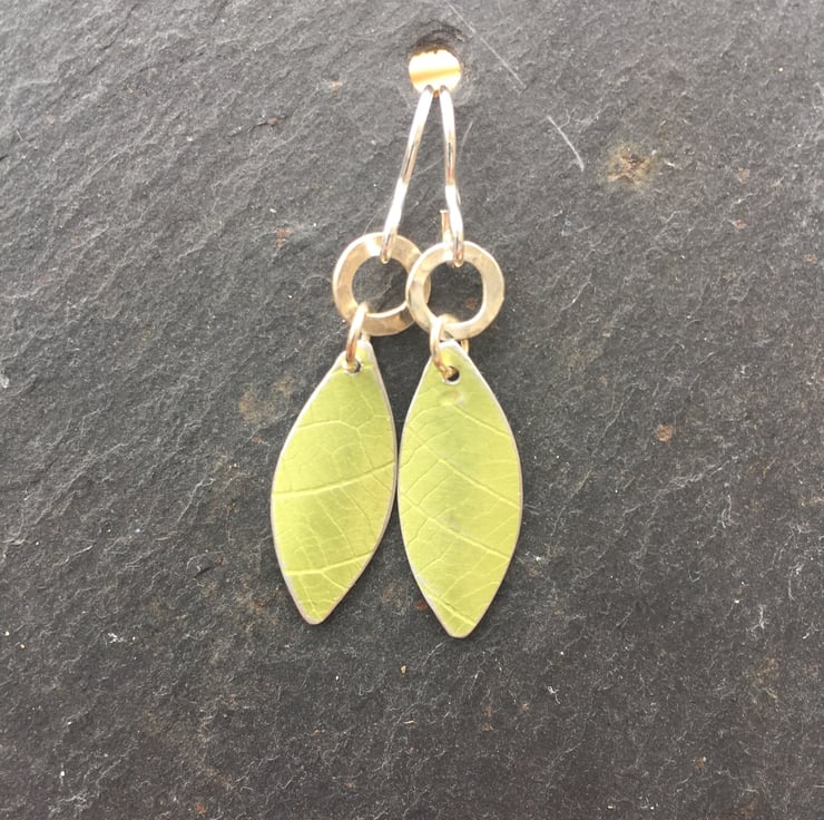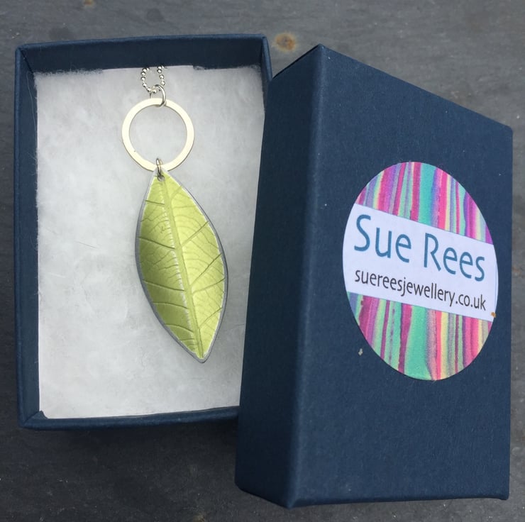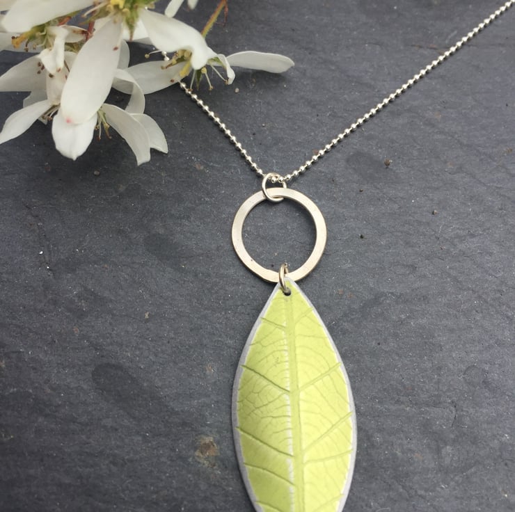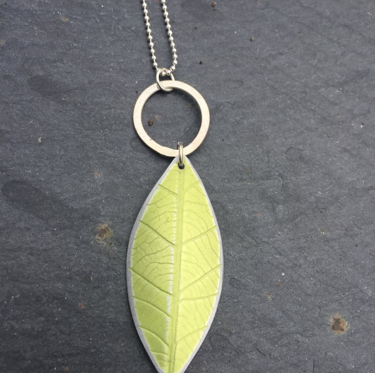 A beautiful leaf shaped pendant which has been dyed lime green and textured using a leaf skeleton. The surface of the metal has been distressed giving it subtle highlights. the leaf has been slightly curved and hangs from a hand forged silver ring.