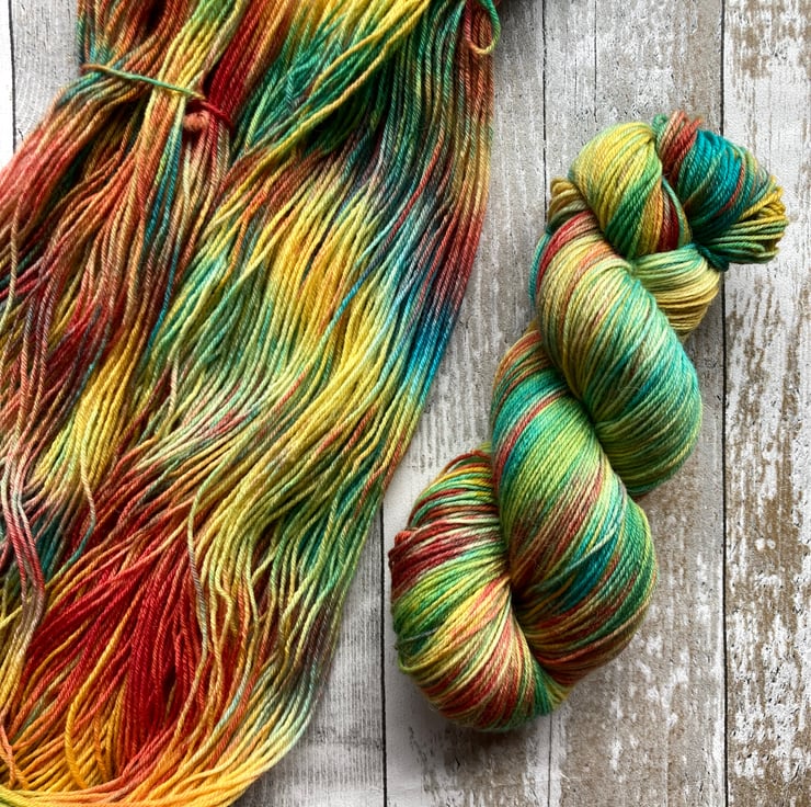Skein of hand dyed yarn 75/25 merino nylon that has bounce and beauty and great for socks, shawls, mitts or whatever takes your fancy.