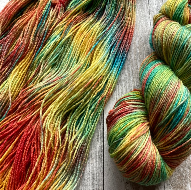 Skein of hand dyed yarn 75/25 merino nylon that has bounce and beauty and great for socks, shawls, mitts or whatever takes your fancy.