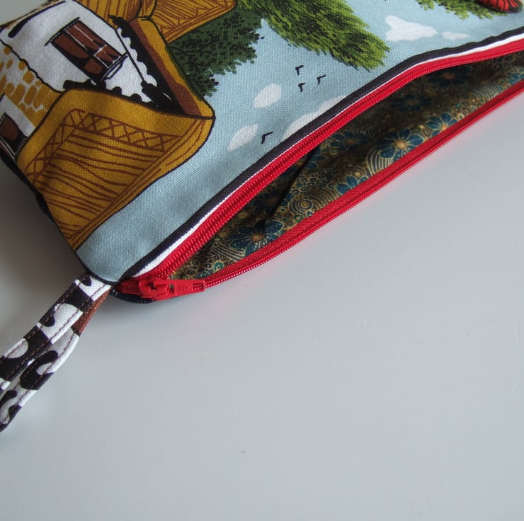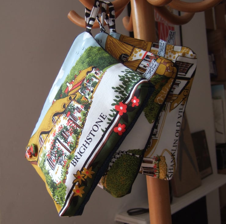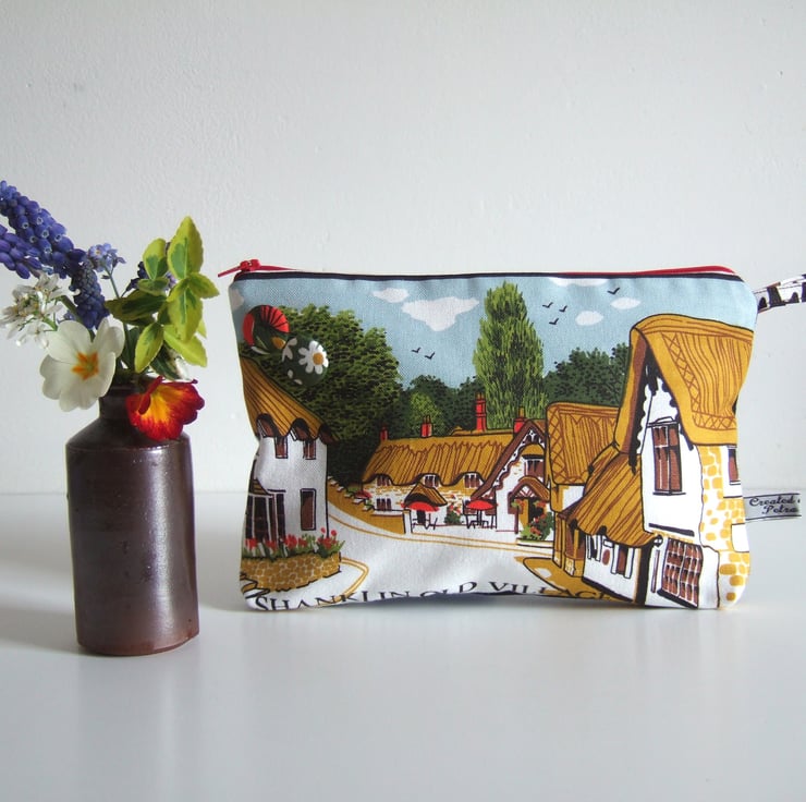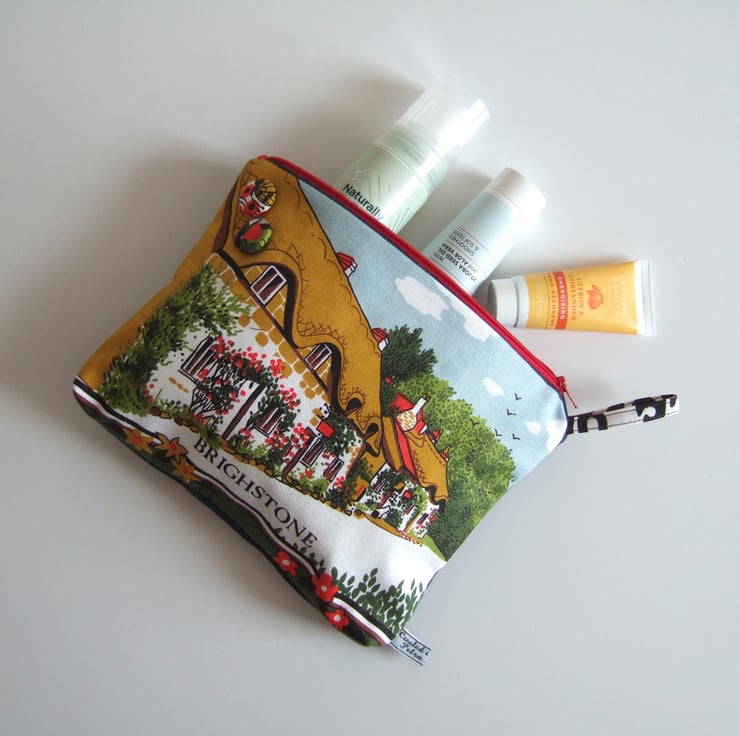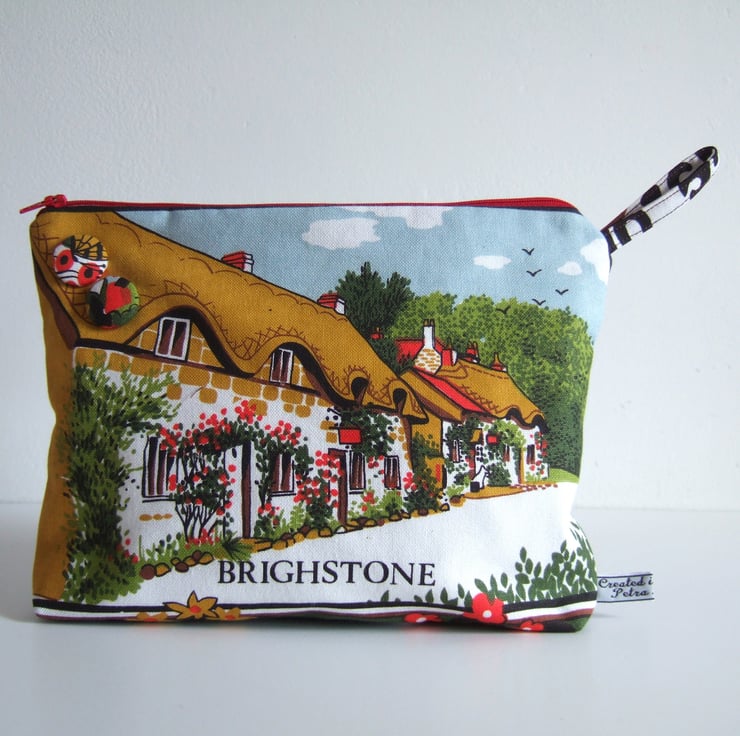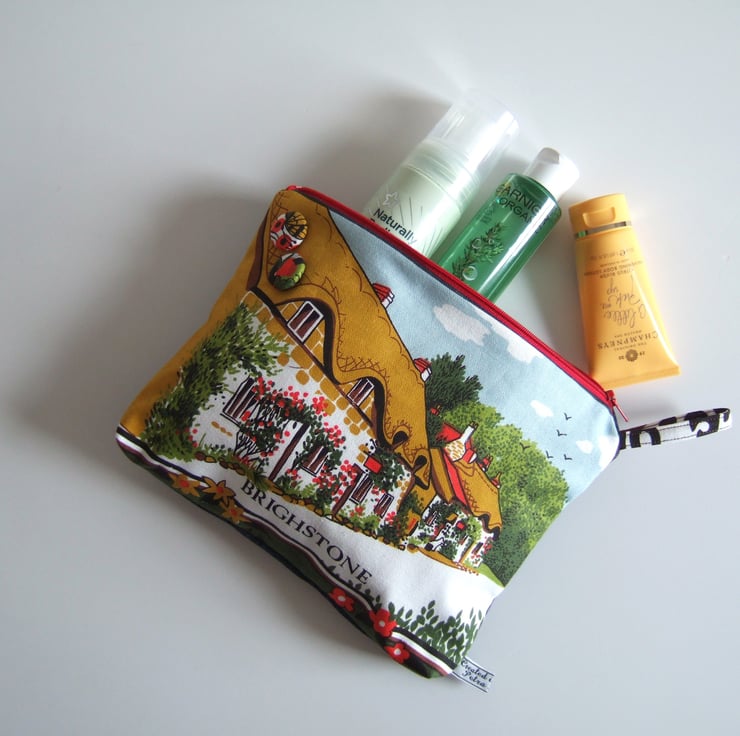 What a lovely illustrative vintage tea towel. I have picked out this sweet cottage in the town of Brighstone on The Isle of Wight for the front. This practical zip up storage bag is perfect for holding cosmetics, small amounts of toiletries or souvenirs.The picture is nostalgic for old fashioned holidays gone by, and would make a nice present for someone who is longing for the Isle of Wight right now.