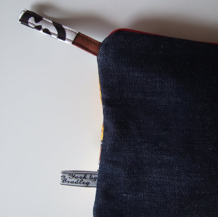 The tea towel fabric has been backed onto cotton to strengthen it, but it is still a soft bag. It measures 19 cm long and 25 cm wide.