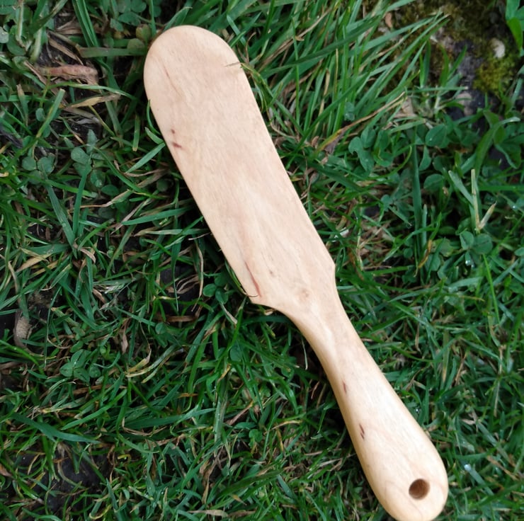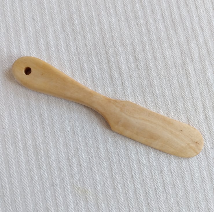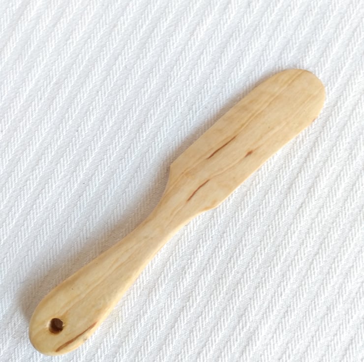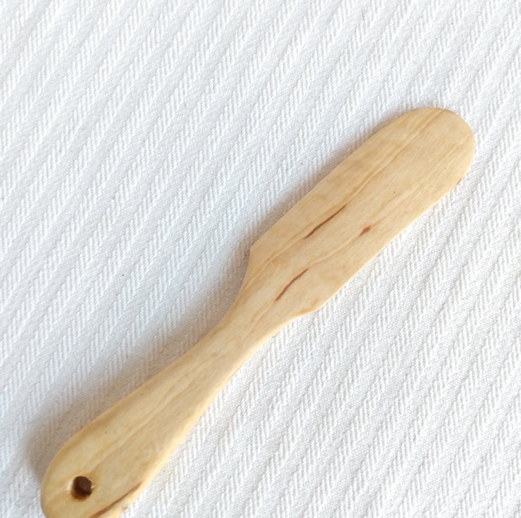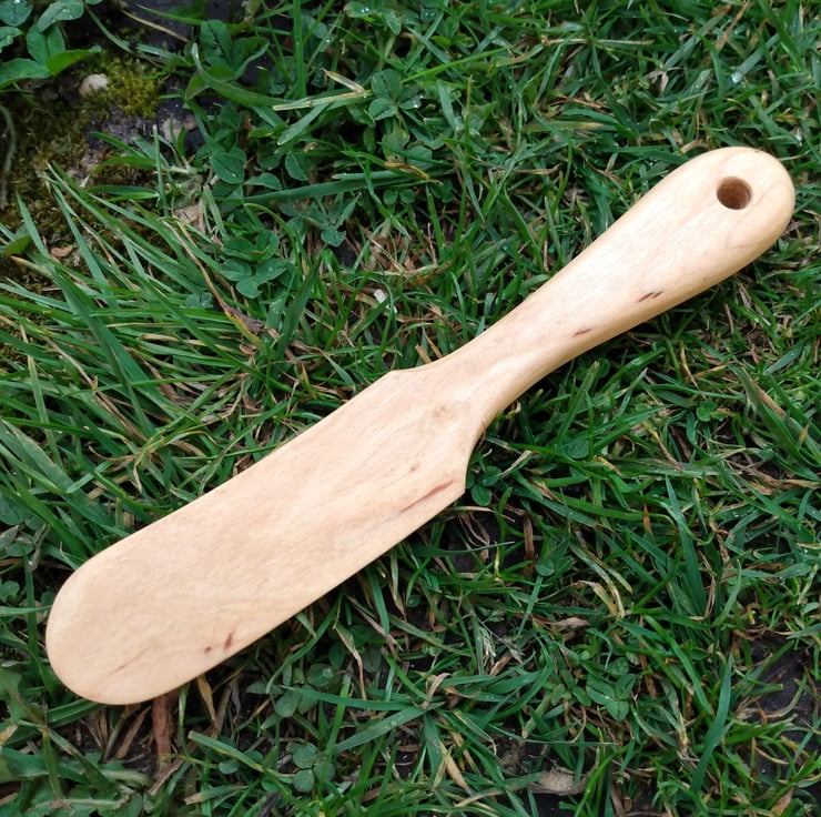 Carved by hand in a beautiful piece of silver birch from Epping Forest. It has truly amazing grain with natural darker flecks and feels very comfortable in your hand. Perfect for spreading butter and jam on your toast, icing cakes, cutting soft cheese and using in your non-stick pans. It has a handy hole if you like to hang your utensils and easy to wash.