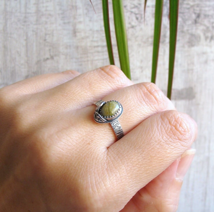 These Epidote stones were mined and cut in Norway. I've set them in a fine silver saw-tooth bezel and handmade tiny silver leaves to solder around the stone. The setting has been soldered onto a bark textured band that stacks well with my other rings or can be worn solo.