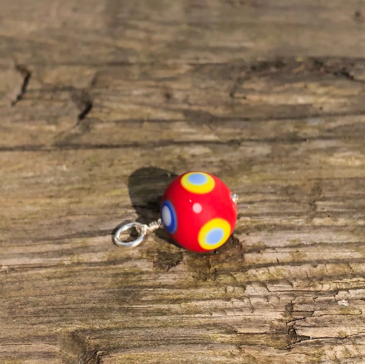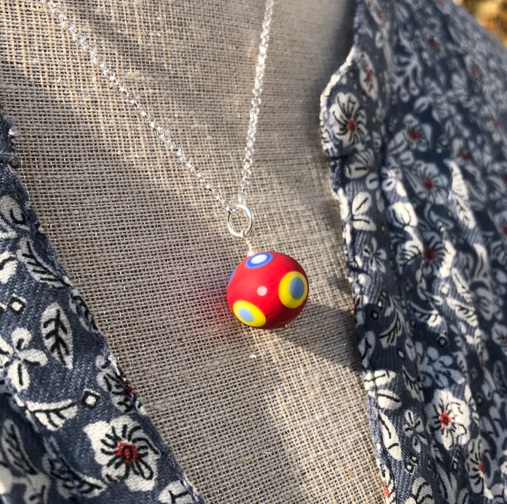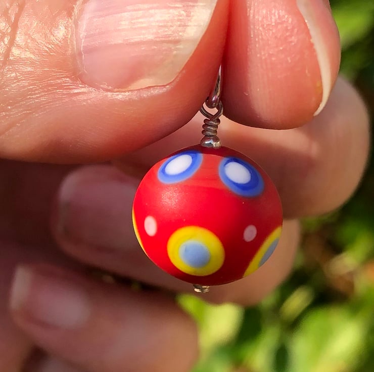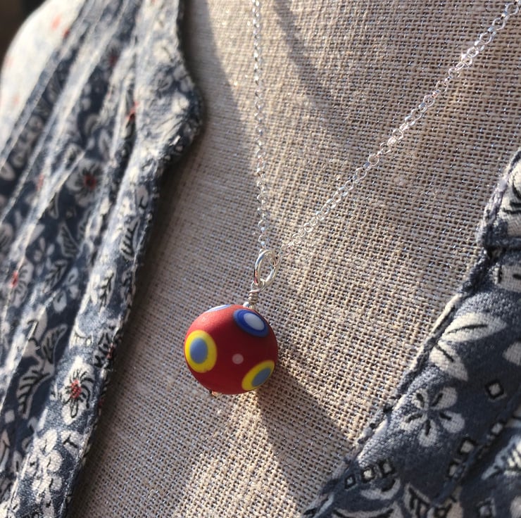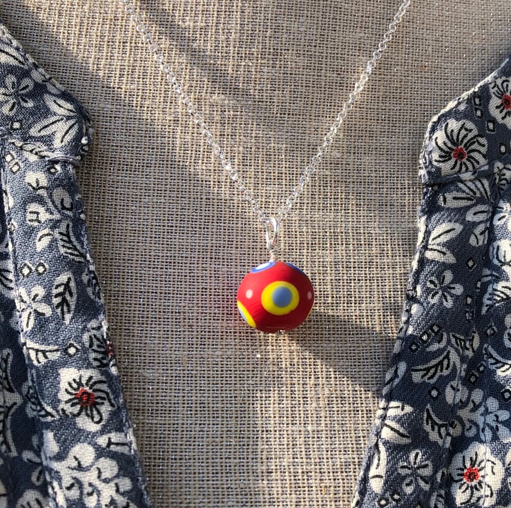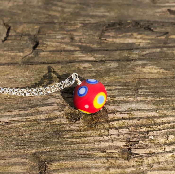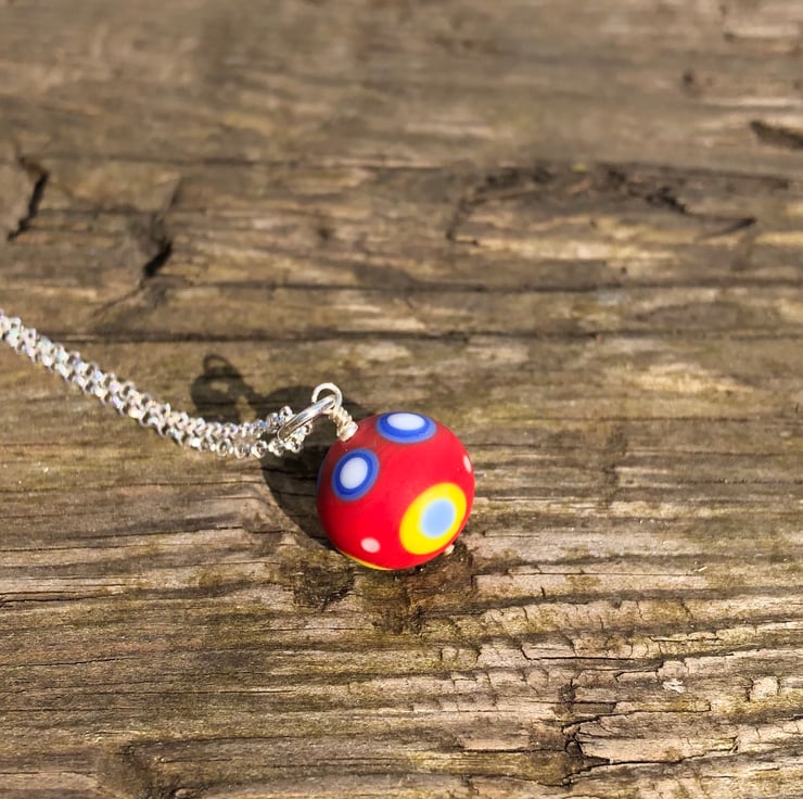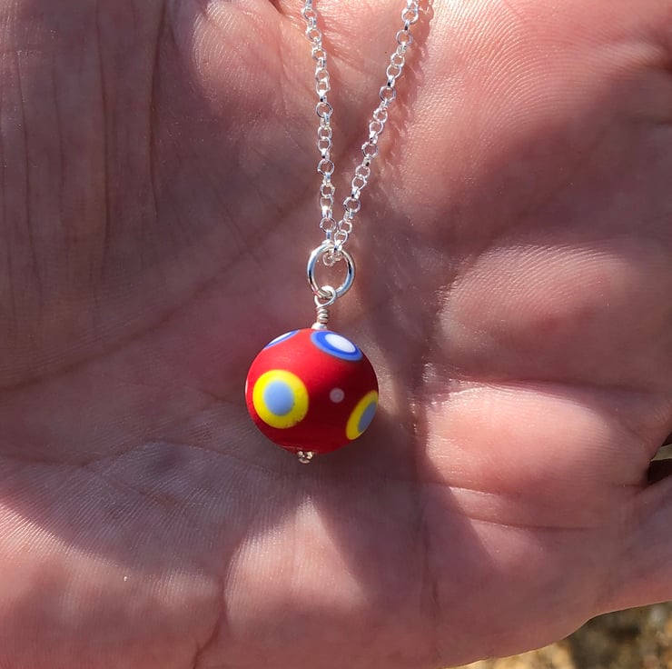 Bright red in colour this stunning bead has been simply hand wired onto a sterling silver headpin with sterling silver beads. Attached to an 18 inch sterling silver belcher chain necklace by a sterling silver jump ring.