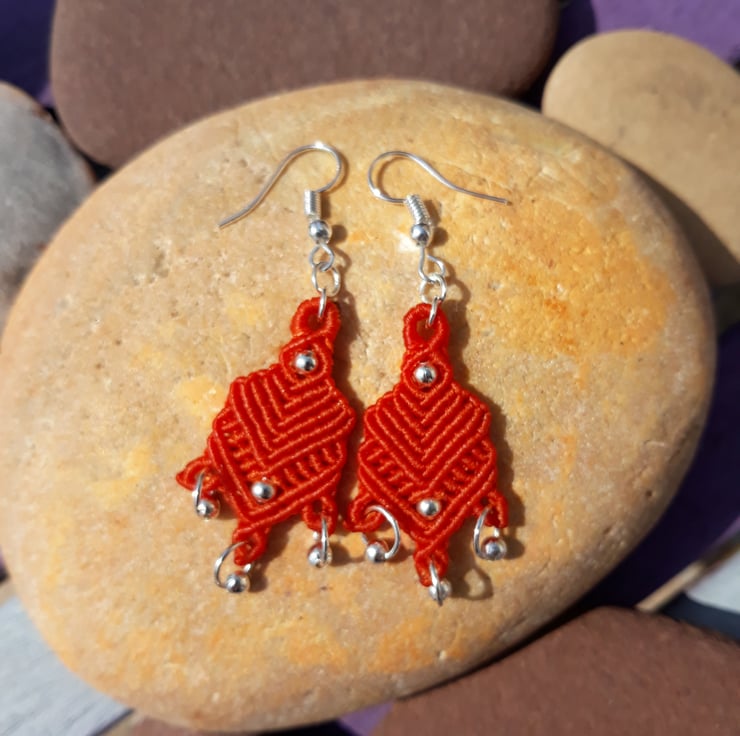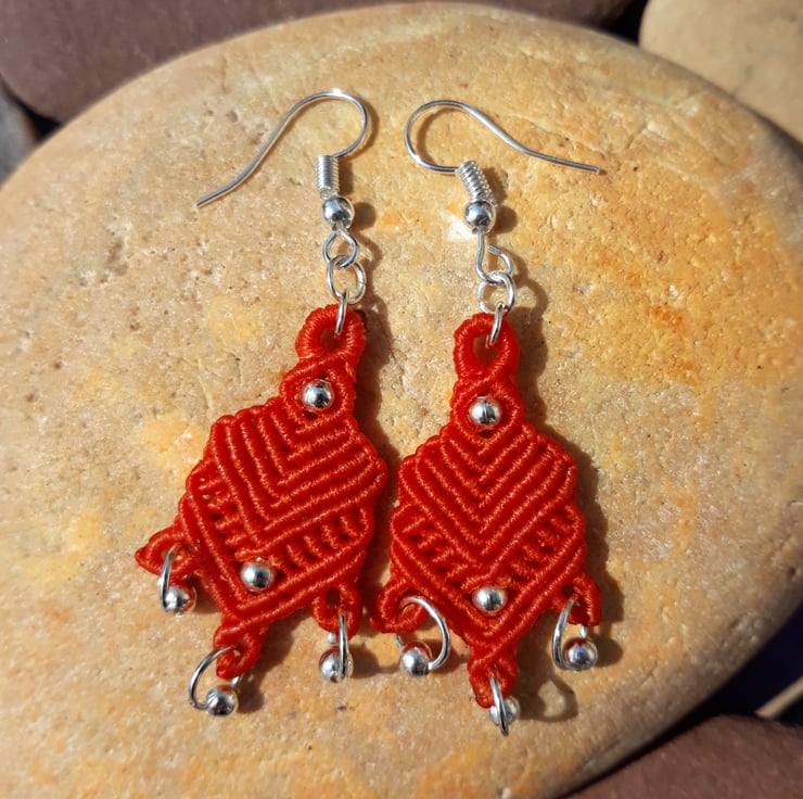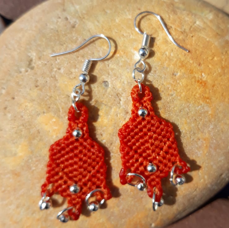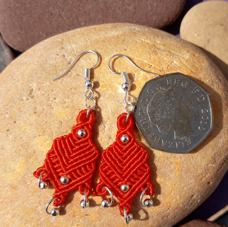 Orange macrame earrings. They measure at 3.5cm. The beads and fish hooks are silver plated. The cord is polyester waxed cord.