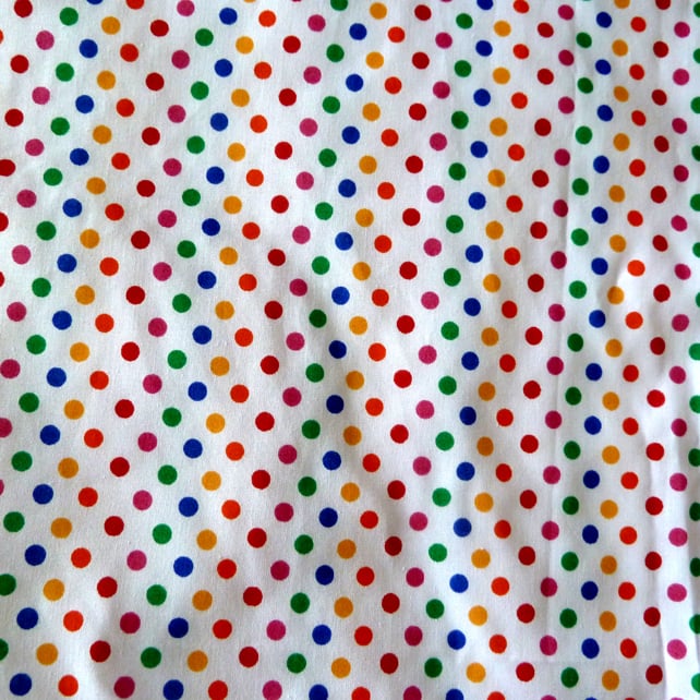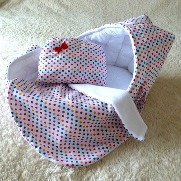 This doll's carrycot is made from polyester cotton fabric which has a multi coloured polka dot design.
