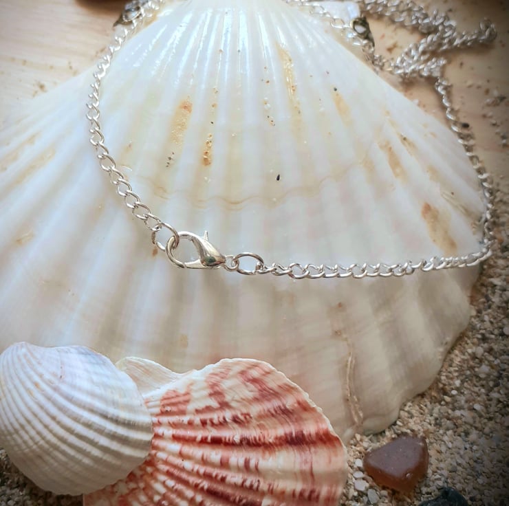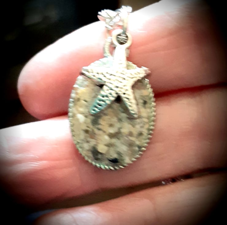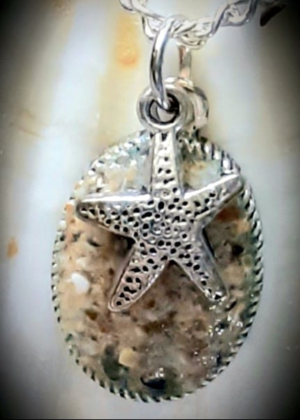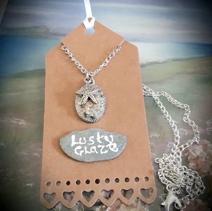 This is a unique handmade pendant necklace made with sand from Lusty Glaze beach ...a beautiful little cove in Newquay Cornwall very popular as a wedding venue . The sand is set and protected and waterproofed in an oval 15mm x 13mm pendant then attached together with a Tibetan silver starfish charm to an 18ins silver plated chain which has a lobster and claw clasp ...transforming just "simply sand" into a beautiful piece of jewellery
