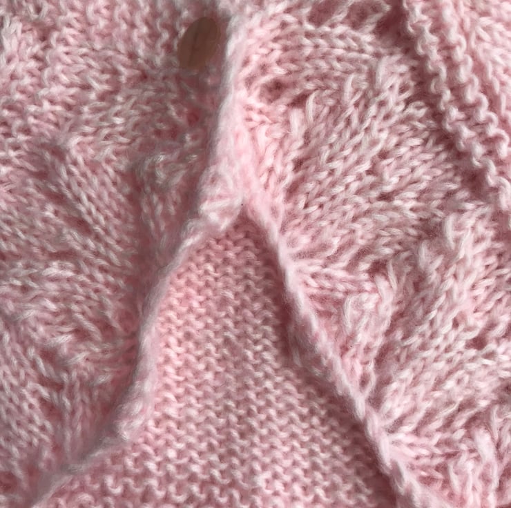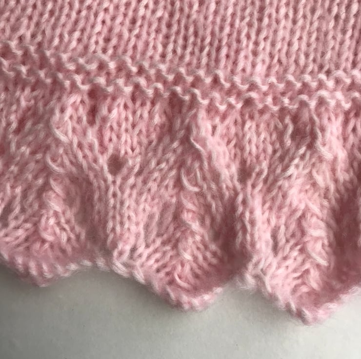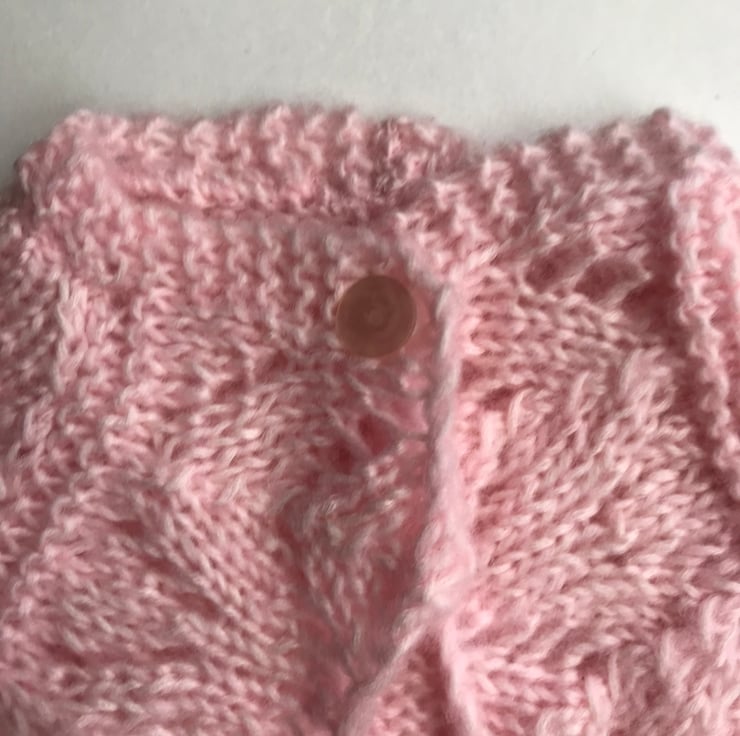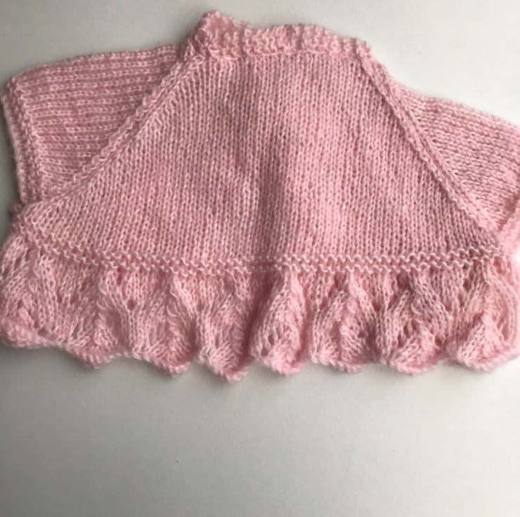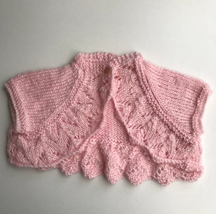 This pretty bolero is hand knitted in a soft fluffy yarn. It features a patterned edge and a stocking stitch body. It fastens with a button at the neck. it would be perfect to wear over a party dress or for a special occasion.