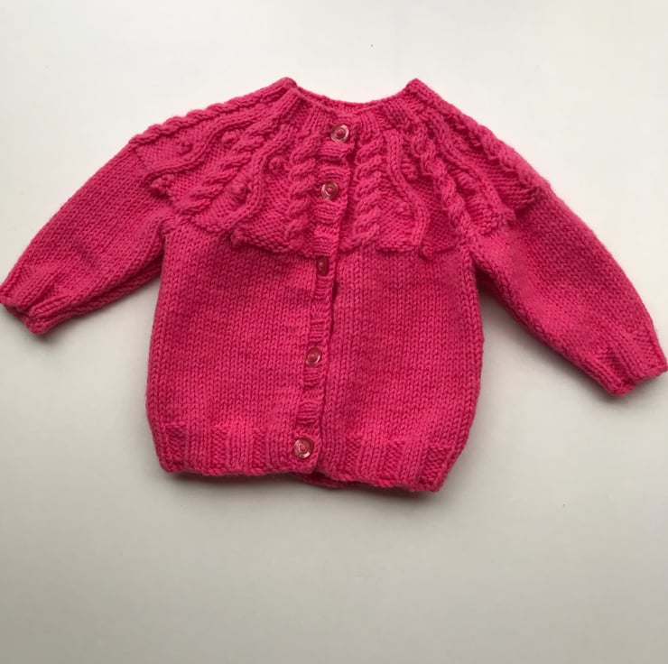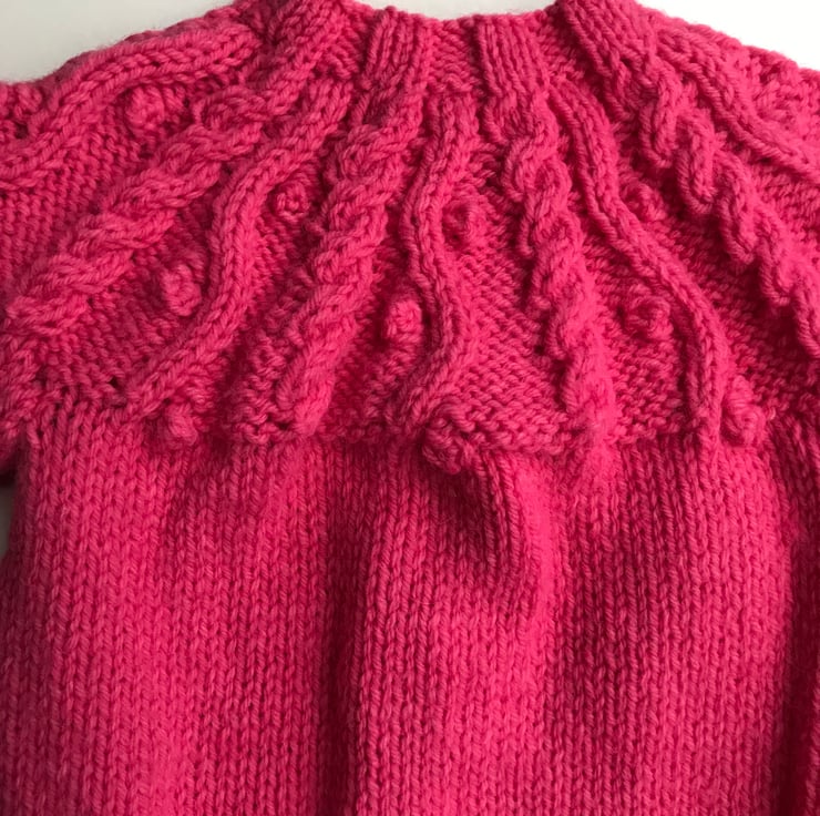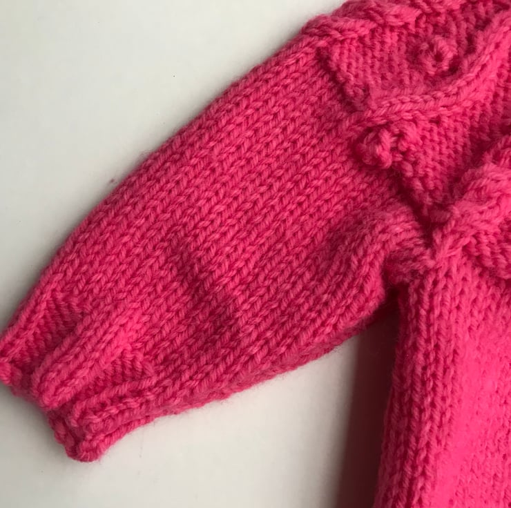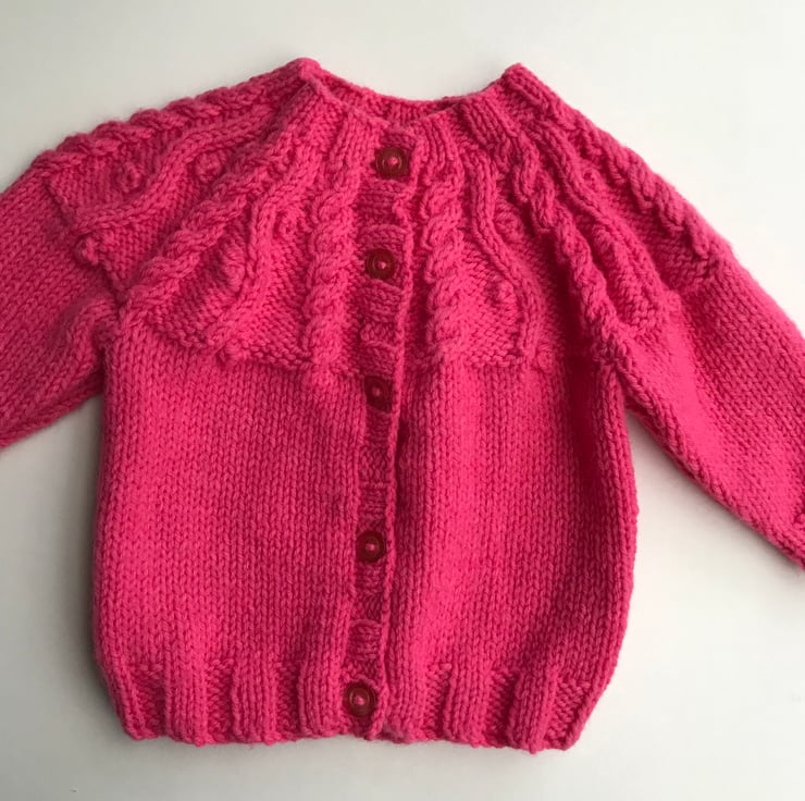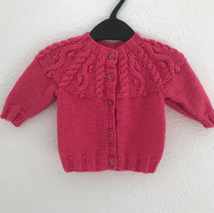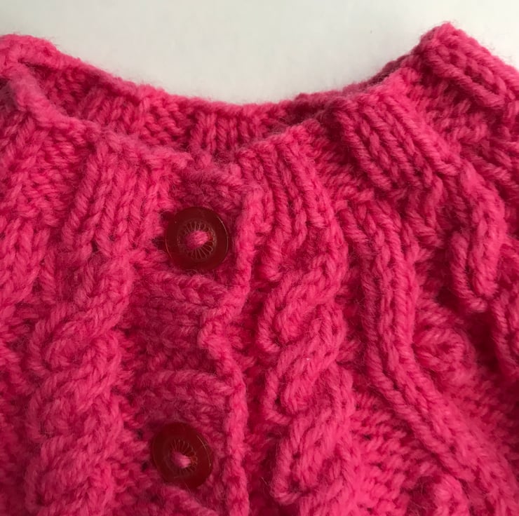 The bright pink cardigan is hand knitted in a soft baby yarn. The main body is knitted in stocking stitch and it has a cable and bobble yolk. It fastens at the front with five buttons.