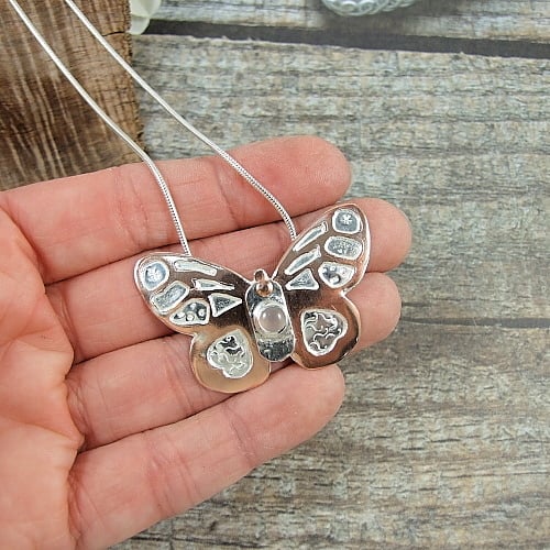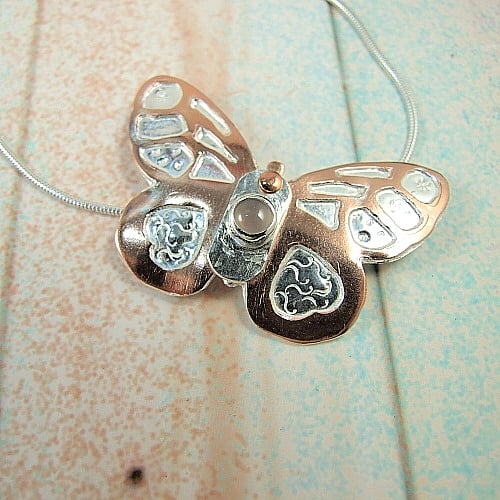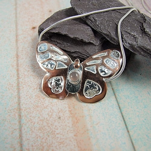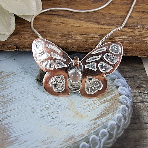 I created this pretty butterfly using copper and sterling silver sheet. I cut the shapes from the sheet and made the cut out pattern in the copper. I soldered the copper overlay onto the silver sheet and then hand stamped patterns in the silver below. Finished with a final layer of hammered textured silver riveted in place set with a delicate pink Chalcedony Gemstone.