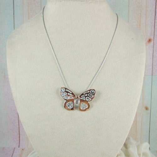 Butterfly Necklace, Sterling Silver and Copper Pendant with Pink Chalcedony.