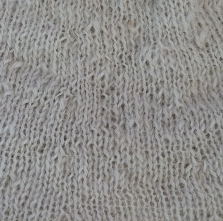 The cowl measures 11.5” deep (knitted section), with a neck circumference of 18”, and a hem circumference of 38”. It uses 1 x 100g balls of handspun yarn. Any equivalent yarn of 12-13 w.p.i, 163m (178yards) per 100g is fine to use. 4mm needles are needed to knit this cowl. Approximately 70g of Longwool Locks are required for the trim. The finished garment weight is 170g approximately.