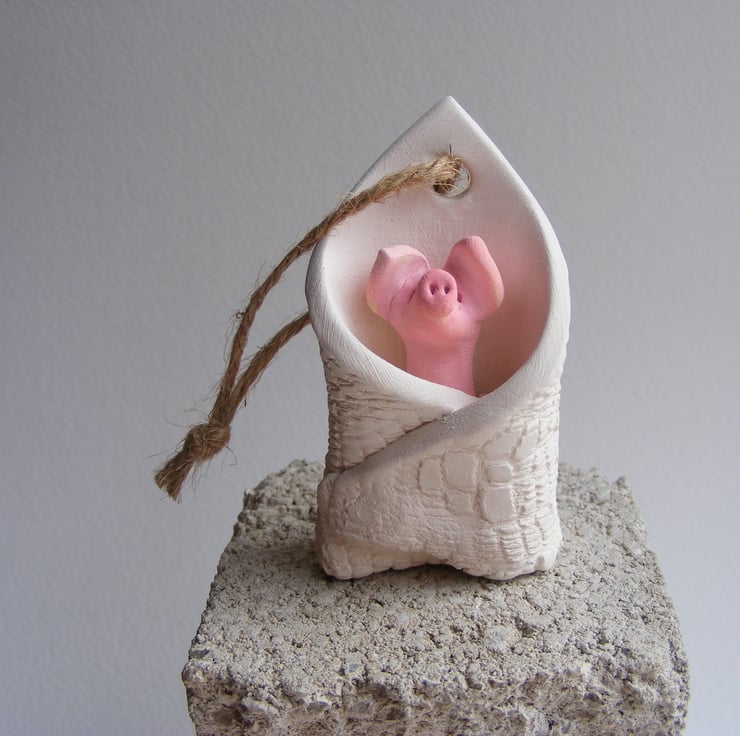 This little pig has been wrapped up in a blanket, all nice and cosy. It measures approx 6.5 cm long and 3.5cm wide. It is made of white earthenware clay, I modelled the pig first then rolled out a piece of clay and impressed a piece of lace in to it, I then wrapped the pig up, used a drill to make the hole for the string to hang it up, it does stand alone. After firing I painted the pig with acrylic paints