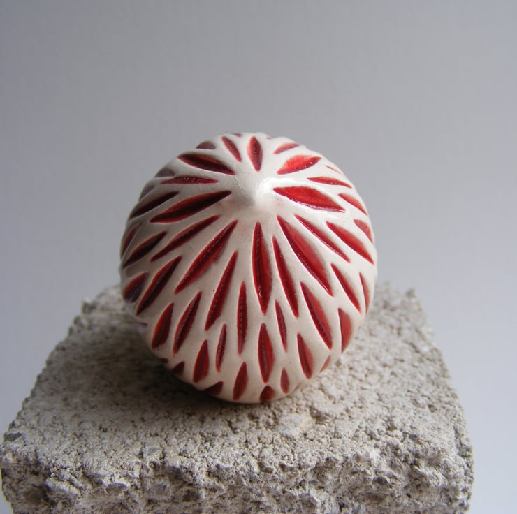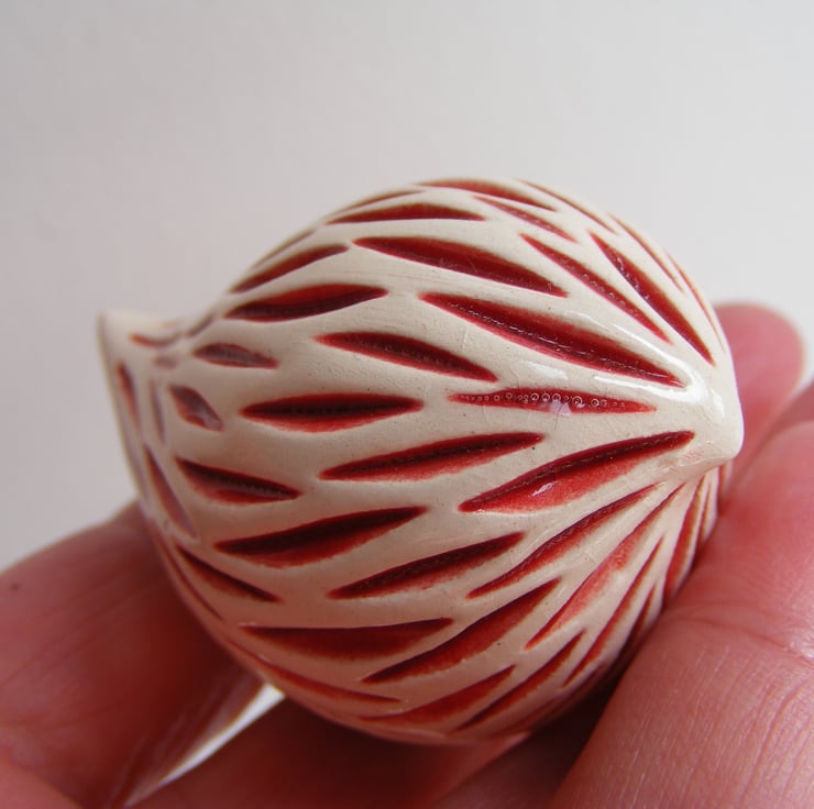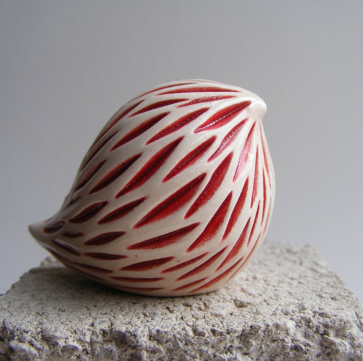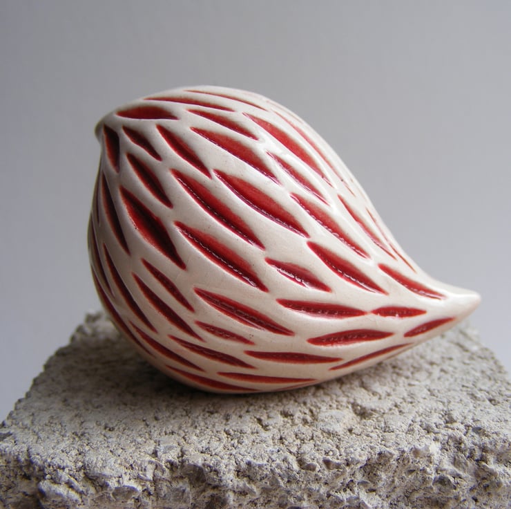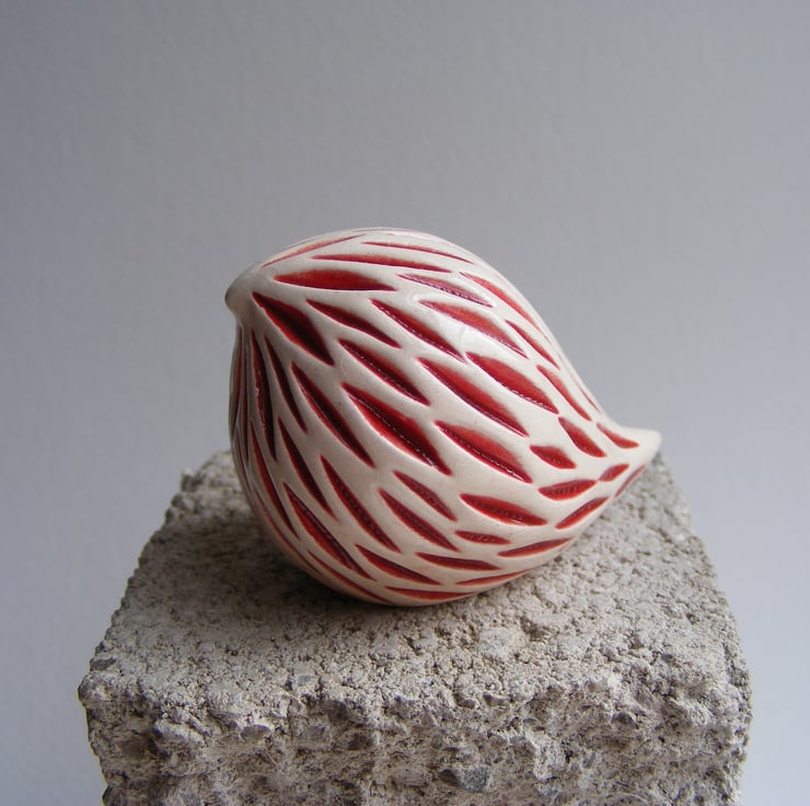 This bird is hand made and measures 3.5cm high and 5.5cm long. It is made from white earthenware clay and carved before being fired in an electric kiln, it is then covered in 3 layers of red underglaze, which when dry is wiped back leaving the glaze only in the carved indents, it is then fired again, after that it is dipped in clear glaze and fired again.