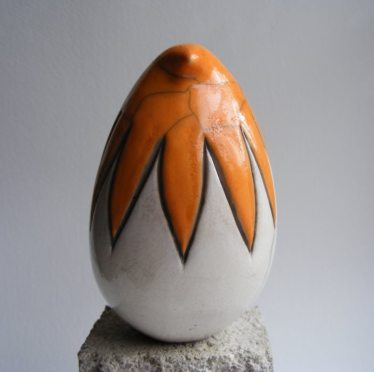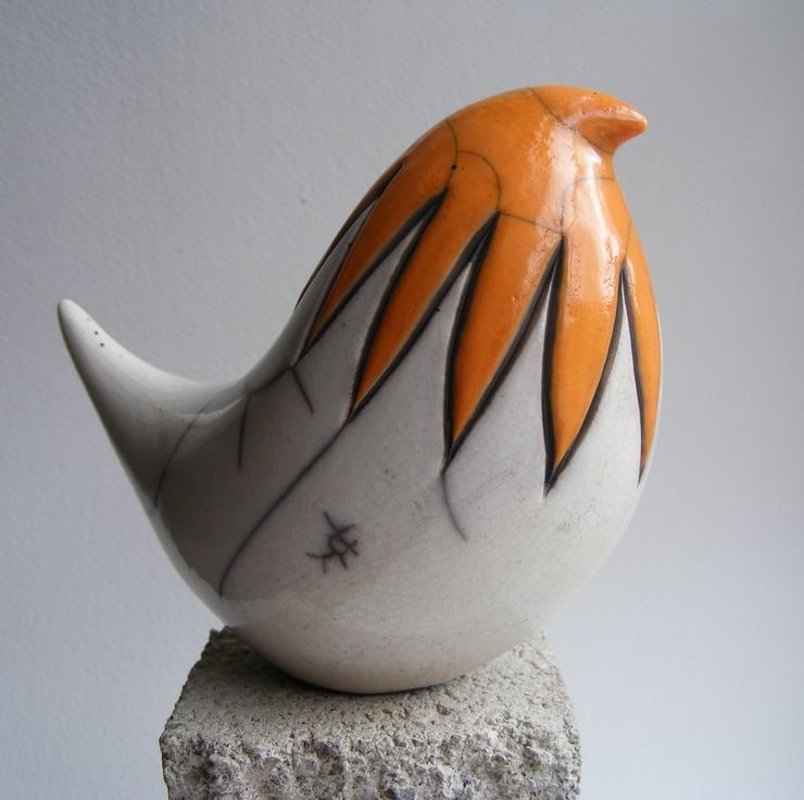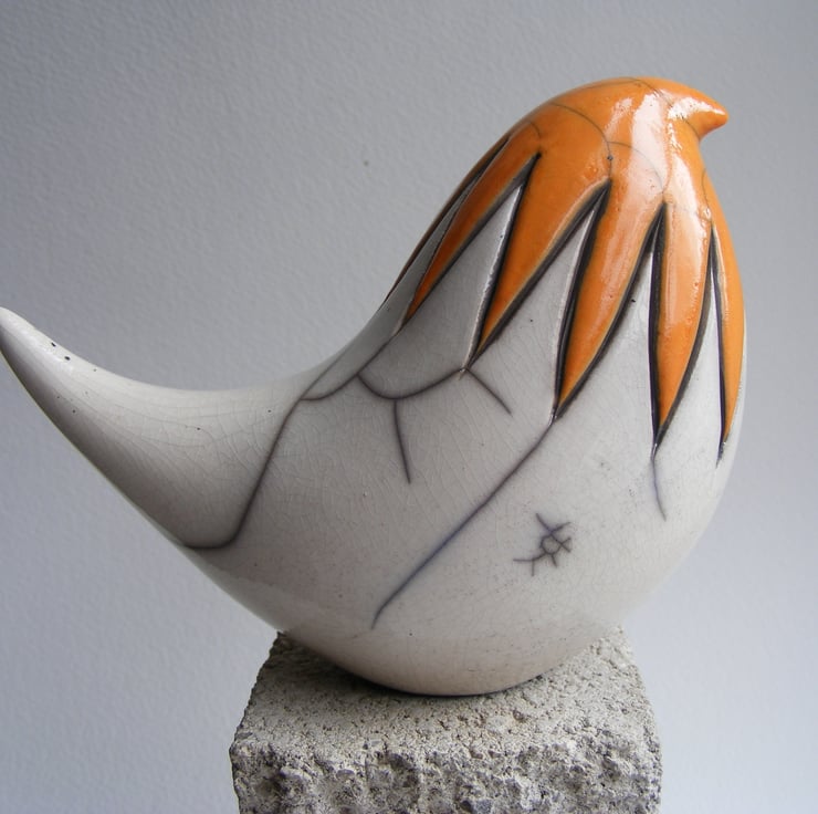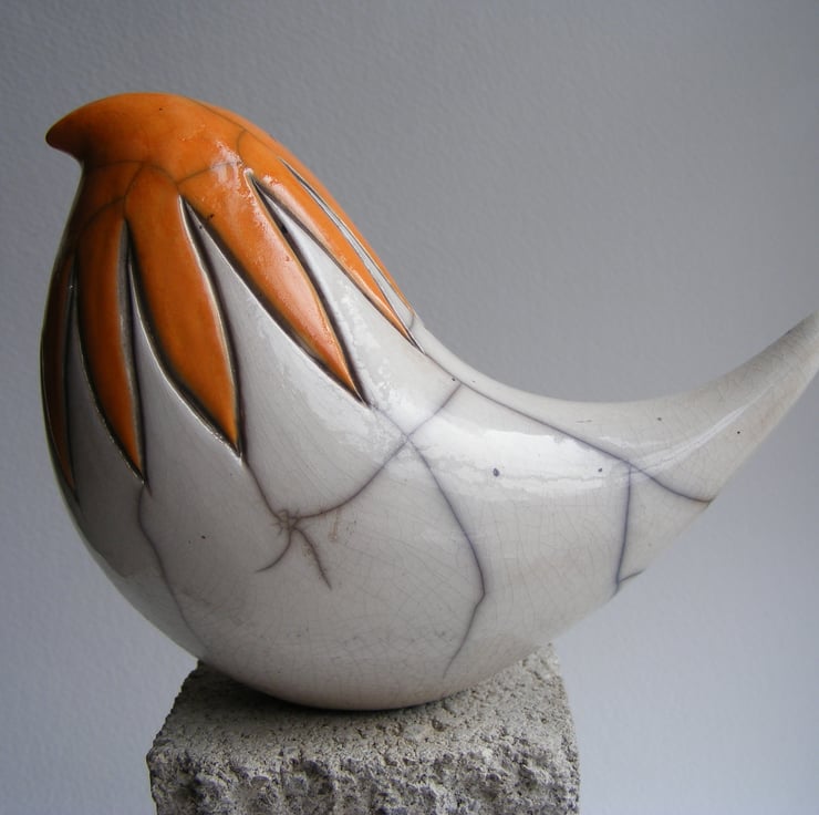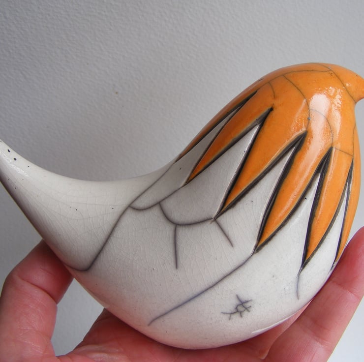 This bird is hand made and measures 10 cm high and 12 cm long. It is made from white earthenware clay and the cut out feathers are carved before being fired in an electric kiln, I then paint on 4 layers of raku glaze, it is then fired again in a gas kiln, then at 1,000 degrees centigrade it is taken out and smoked in a container with sawdust, this makes any unglazed part of the bird and the crazing turn black.