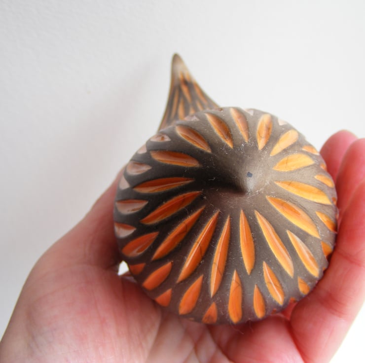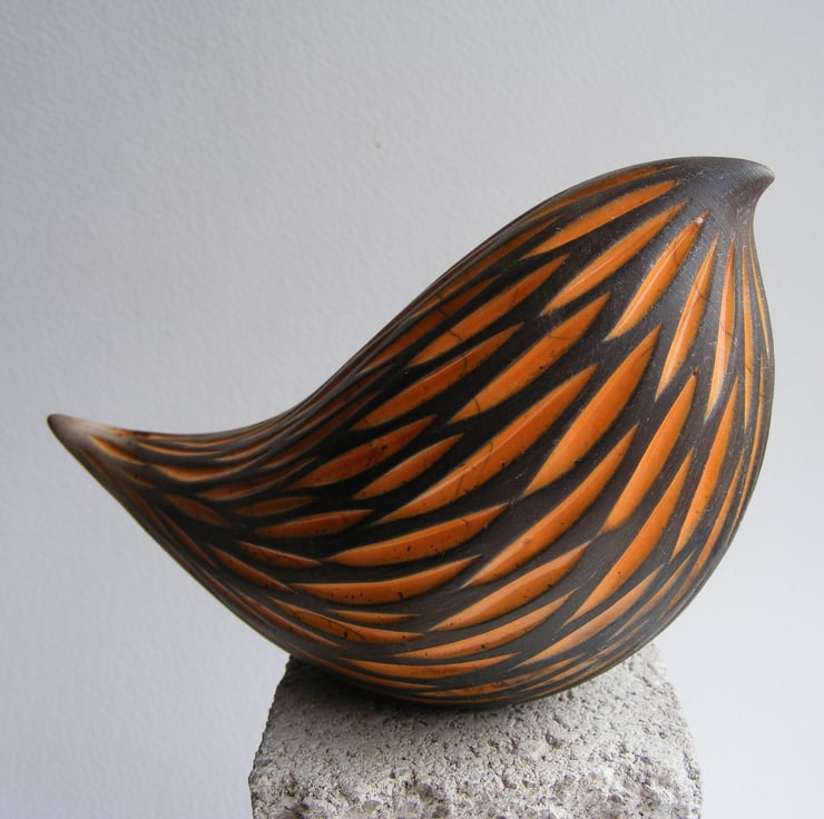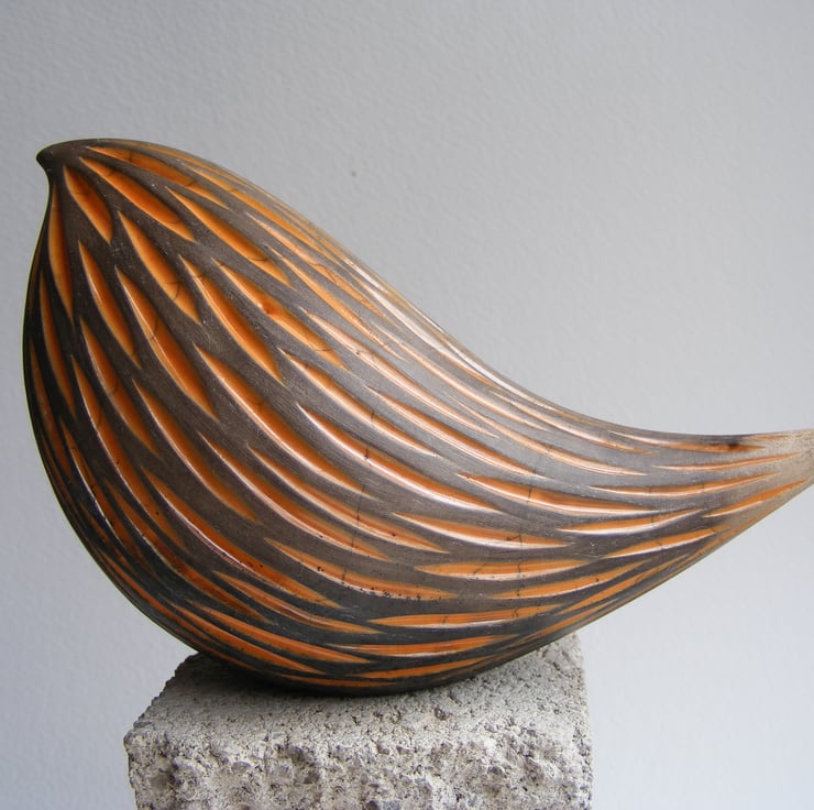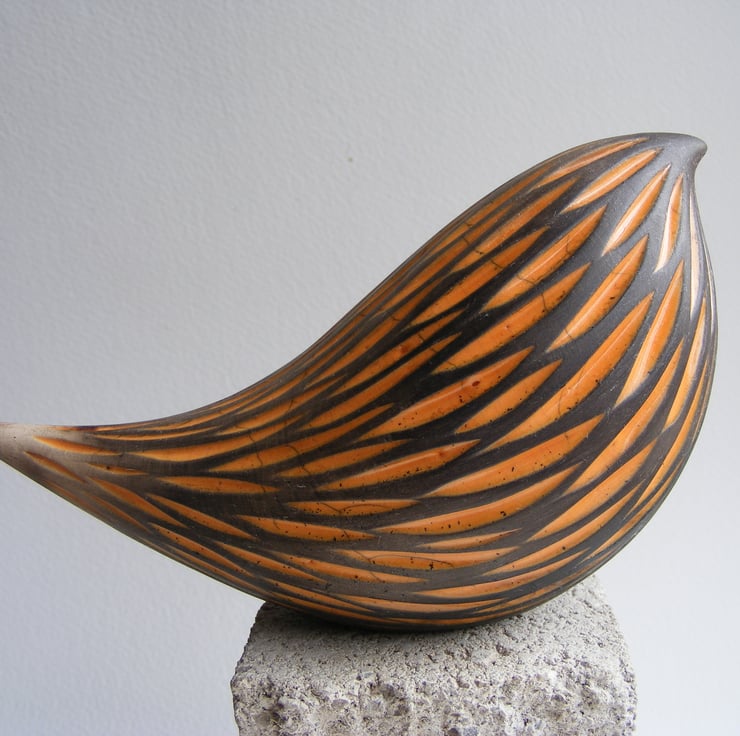 This bird is hand made and measures 8 cm high and 13 cm long. It is made from white earthenware clay and carved before being fired in an electric kiln, I then paint on 4 layers of raku glaze, which when dry is scraped and wiped back leaving the glaze only in the carved indents, it is then fired again in a gas kiln, then at a 1,000 degrees it is taken out and smoked in a container with sawdust, this makes any unglazed part of the bird black. It has been polished with bees wax.