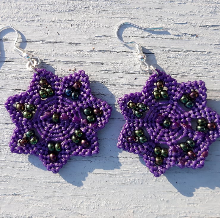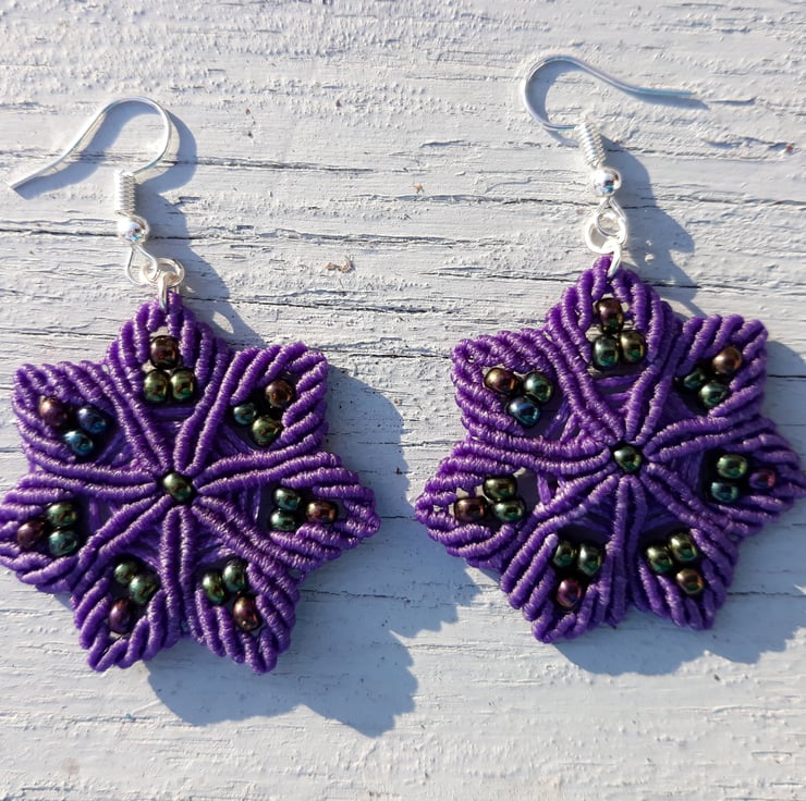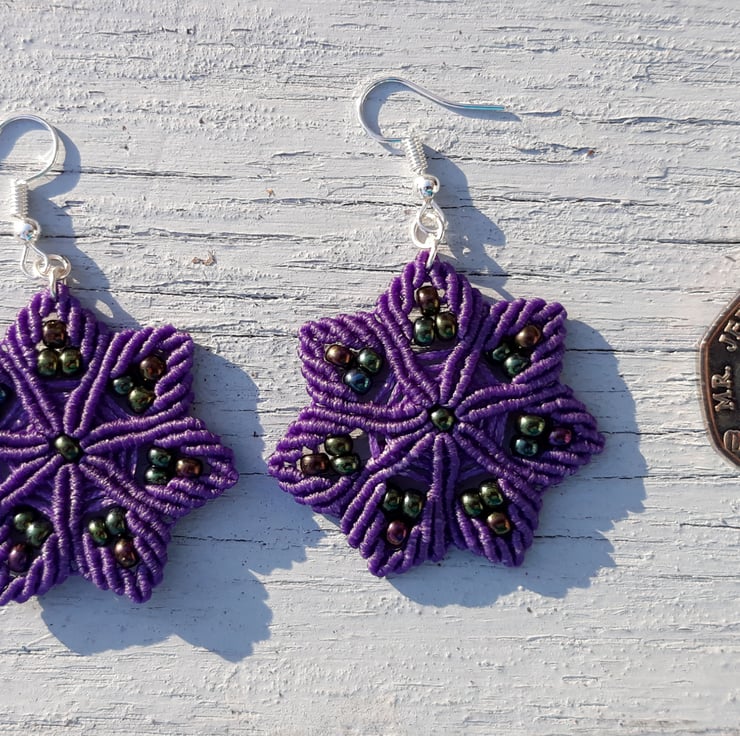 These purple macrame flower earrings measure at about 3.5cm. The fish hooks and jump rings are silver plated.
