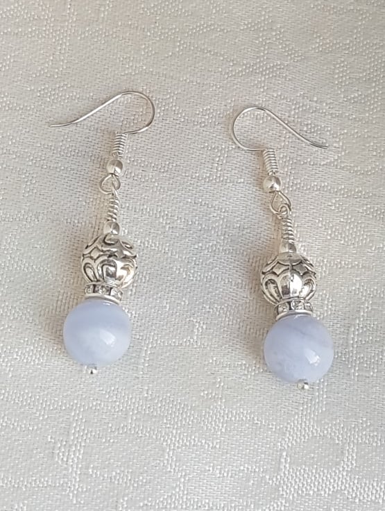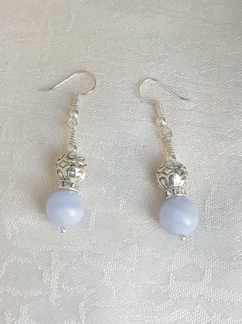 Gorgeous Blue Lace Agate and Fancy Bead earrings. The fabulous pale blue and silver tones go so well together. Gorgeous Blue Lace Agate beads and fancy Silver tone beads make this a stunning and original pair of earrings. Great as a gift or as a special treat for yourself.