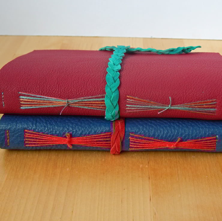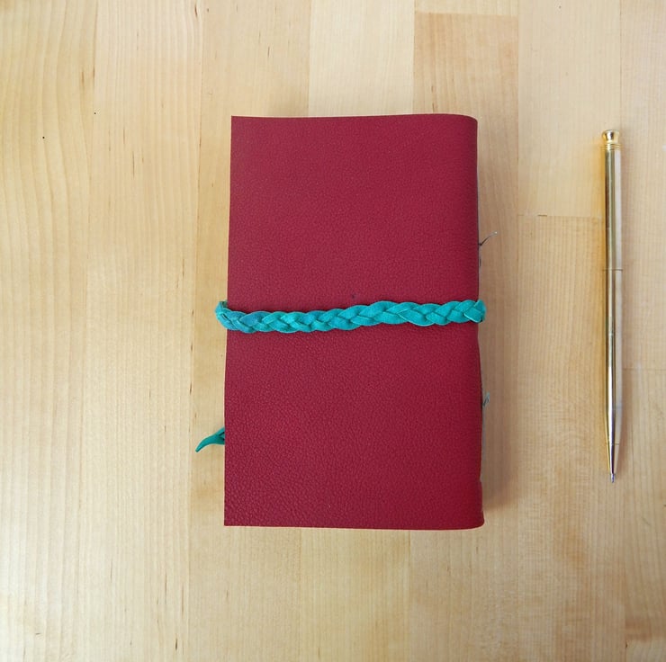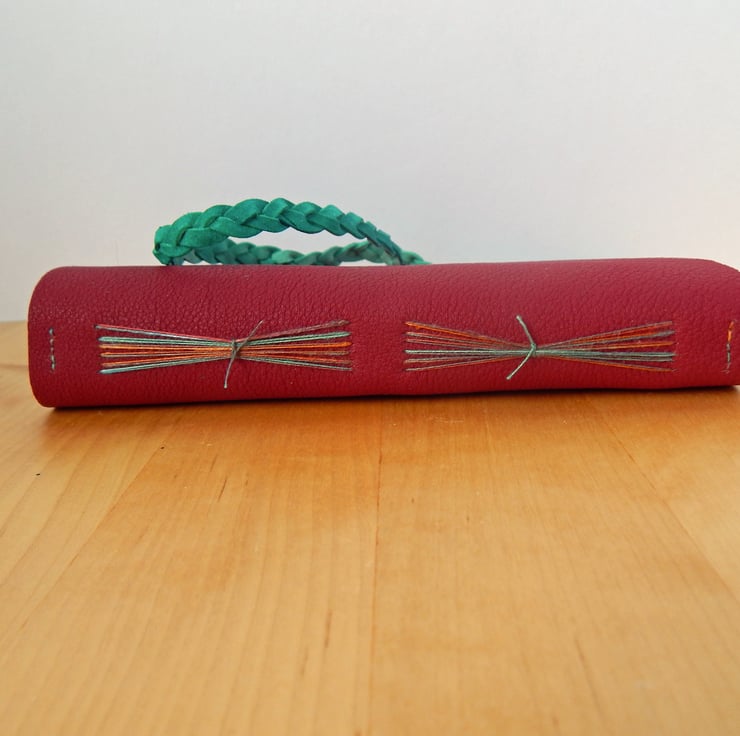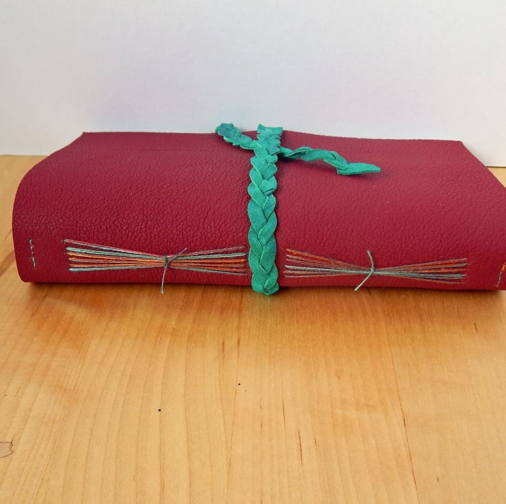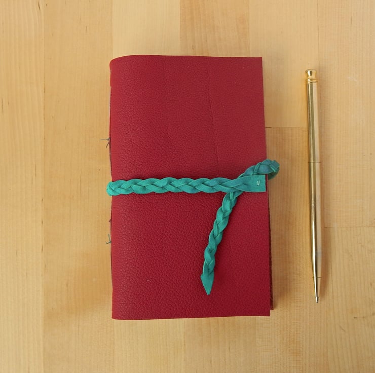 The cover is a thick, soft leather with a grained finish, in crimson red. A plaited strip of viridian green suede wraps around the cover and tucks in at the front to keep the book closed. The leather is left unlined, as it is very attractive inside, as well as outside.