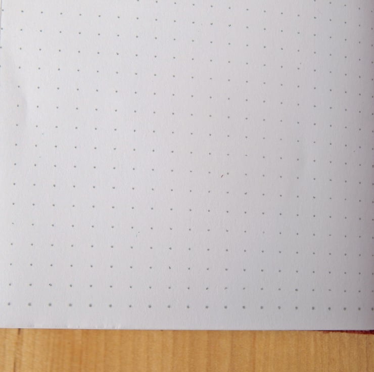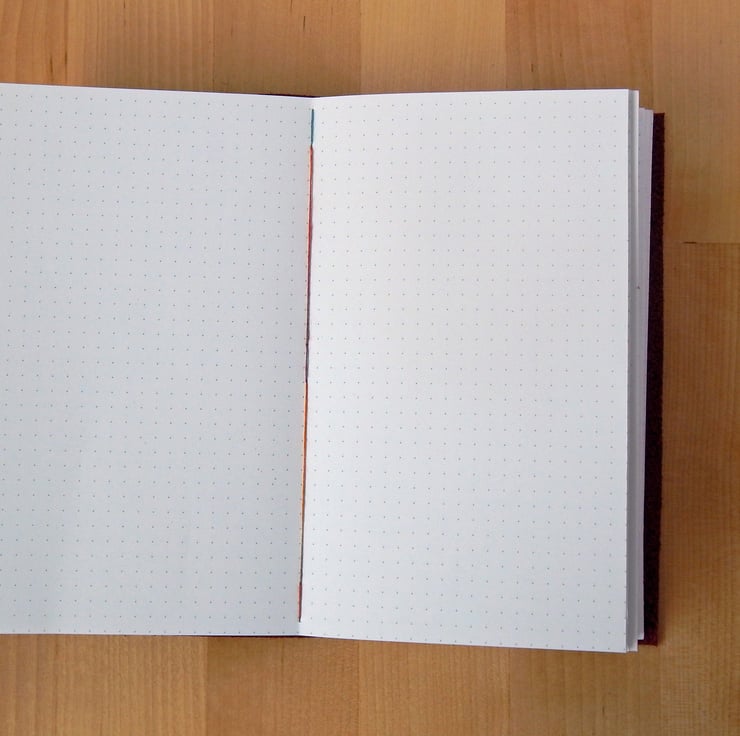 There are 60 pages (120 sides) of Fabriano 85gm dotted paper, in ivory white, hand bound in six sections of ten.