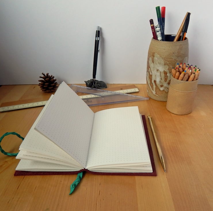 A lovely journal of soft red leather, with a wrap fastening cord of green suede and decorative linen stitching. There are dotted pages, making this an ideal bullet journal, or traveller's notebook.