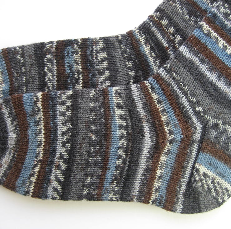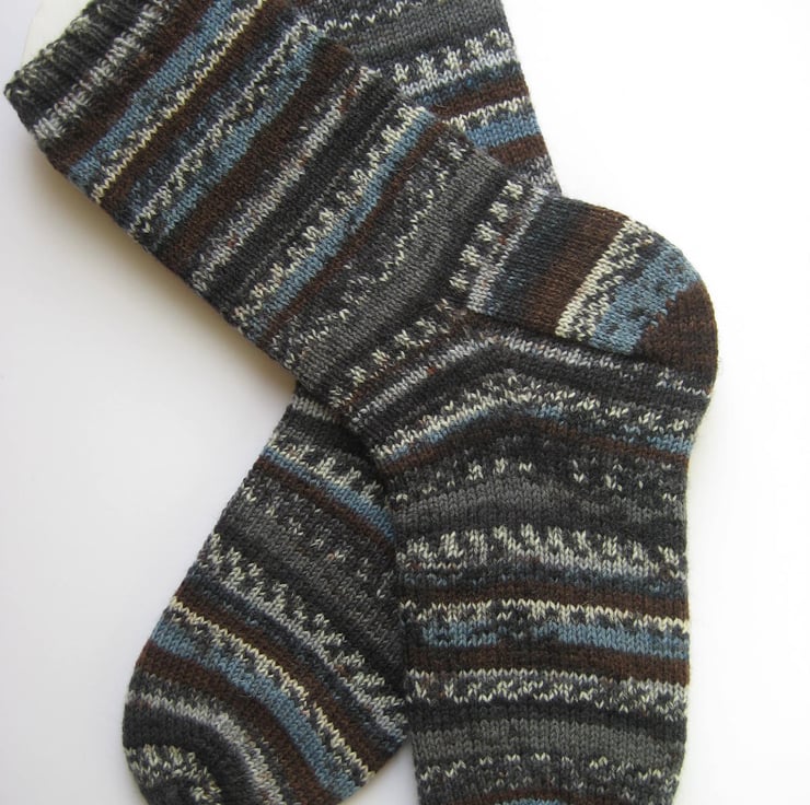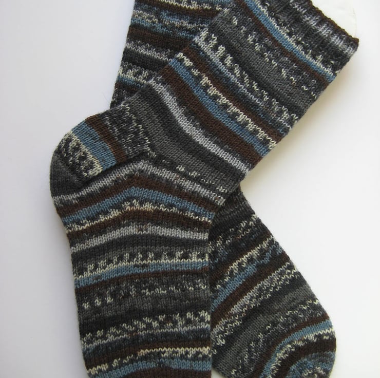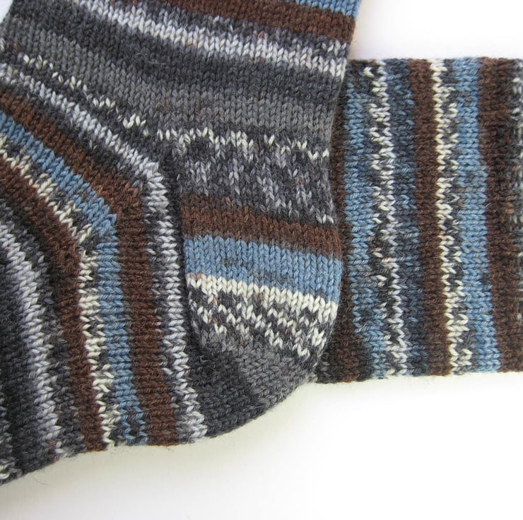 Hand knitted in the round on 5 double pointed needles, these mismatched wool socks are made from Fabel 4 ply self patterning sock yarn, 75% wool 25% polyamide, in shades of blue, grey and brown. Made from very fine yarn, they are not thick and will fit most footwear. Warm and durable, these socks will keep your feet comfortable throughout the year.