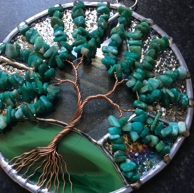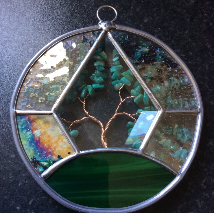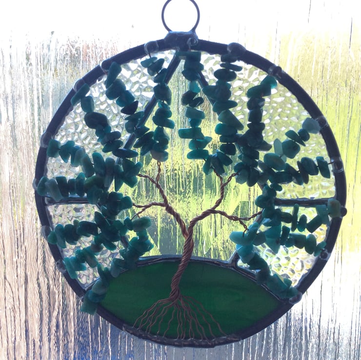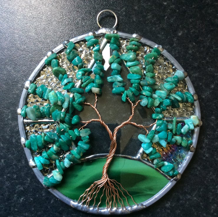 The hanging measures 130mm diameter and is made from iridised ice crystal glass with a dark green mix glass base and a diamond bevel all of which have been wrapped in copper foil and soldered together.. The tree is made from twisted copper wires and heavily decorated with tumbled amazonite gem chips in lovely turquoise shades.