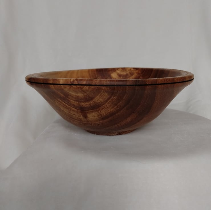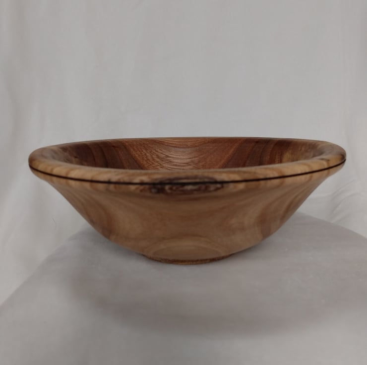 Bowl for soup, puddings, cereals & snacks. Like all my bowls this is so useful for hot and cold food, easy to wash and the patina will just grow with use and age. This one has glorious figuring to the grain and I've complemented that with long sweeps of my chisels to give a flowing design profile that echos the grain. I've carved a single line around the outer rim with a very fine chisel tip and then burnt the groove using only friction to give a stylish black line detail. Measures 14cm in diameter and is 5cm high.