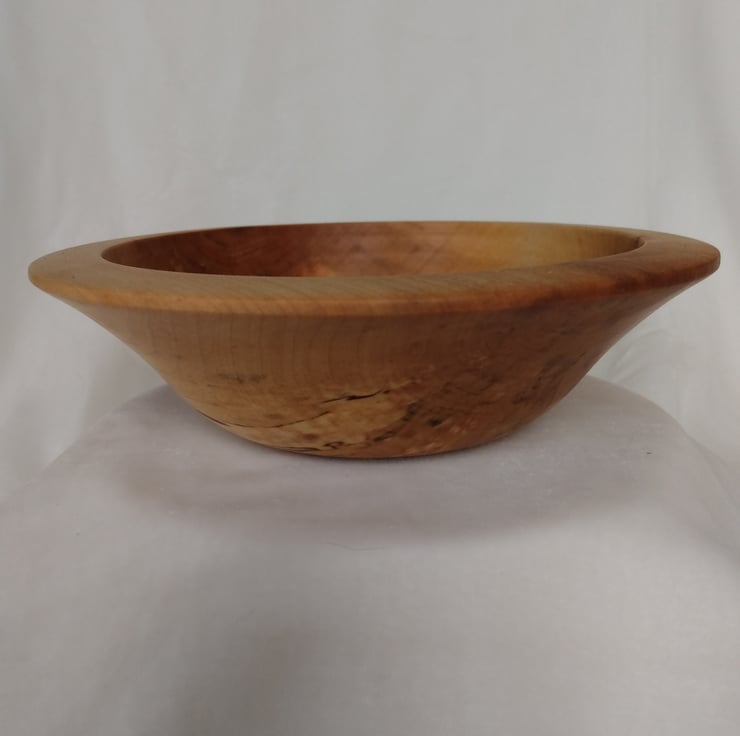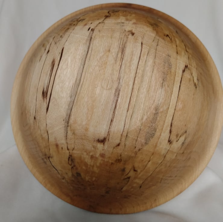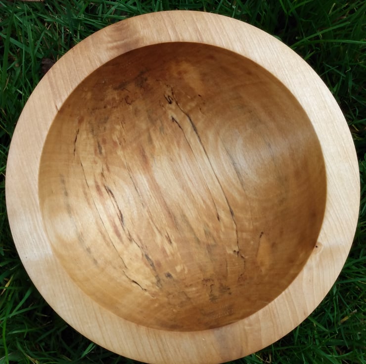 An excellent eating bowl, a great depth for hearty broth & generous puddings. Like all my bowls the uses are whatever you decide, these are lightweight and durable and easy to wash and dry. The spalting is a natural feature in the wood and develops where the log has been laying in a large piece on the ground, open to the elements. This lump had been hanging around for a while and it was whilst clearing up in the workshop I thought I'd just take the axe to it and see if it was still good to use. The grain turned out to be absolutely outstanding and this is one of several, all different, bowls transformed from a nasty looking old log into a magical looking bowl. This has a lovely sloping outer profile and a broad rim, the outside grain is as stunning as the inside!