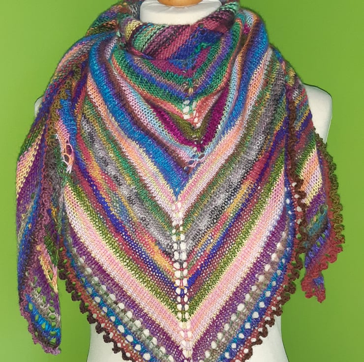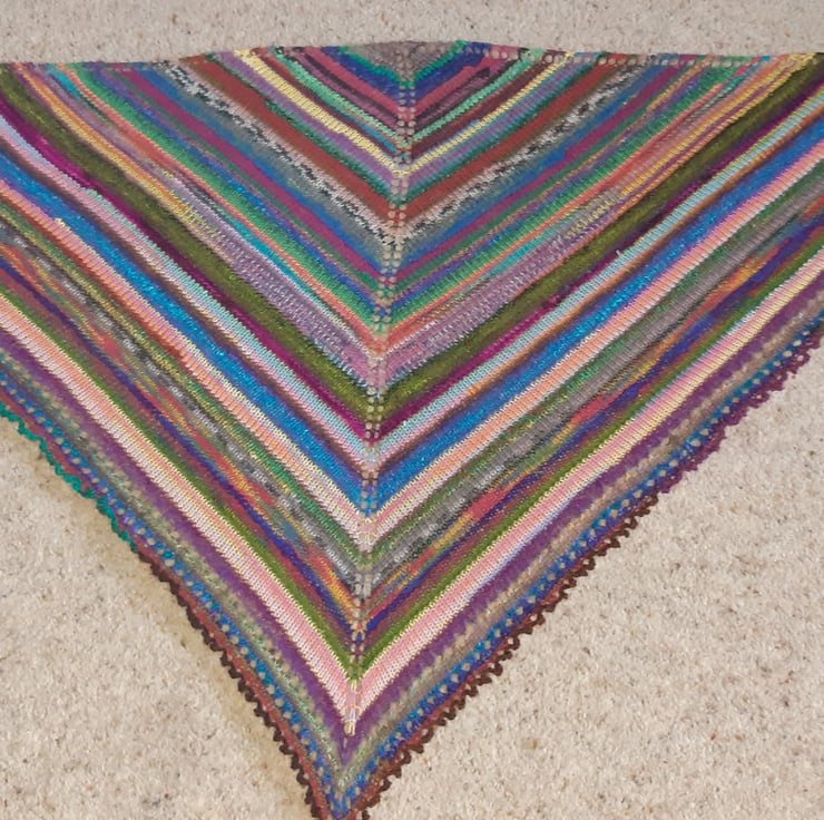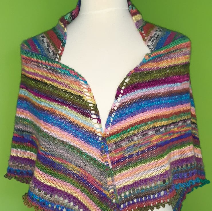 This is a pattern for a triangular shawl I have designed for you to knit. This lovely shawl uses all those left over scraps of 4ply sock yarn that you just cannot throw away! Each shawl will be unique and colourful. It is knit in stocking stitch with a garter stitch edge, and eyelet and picot border to finish. All the scraps of yarn are joined using a Russian join.