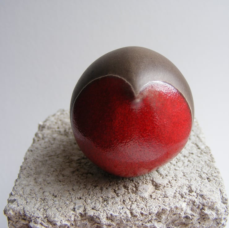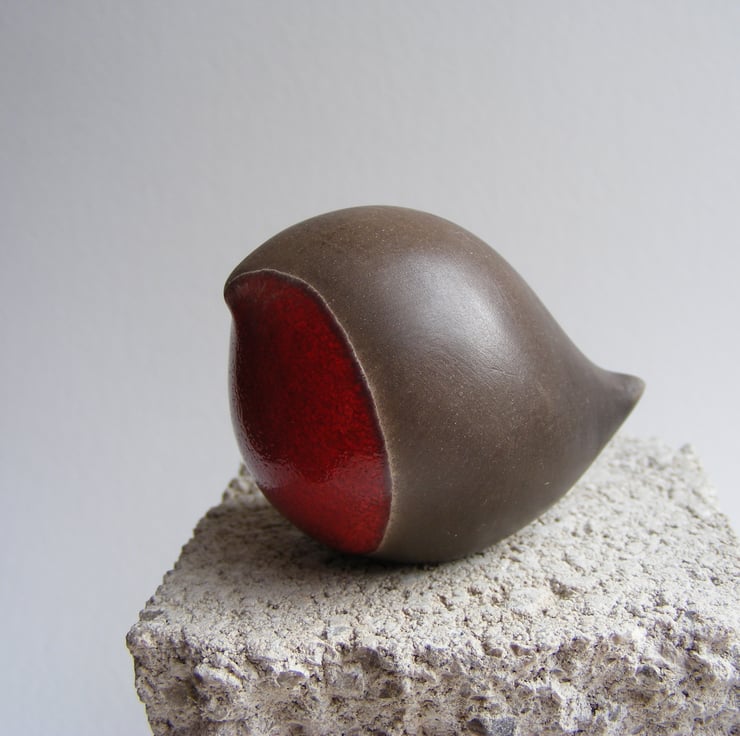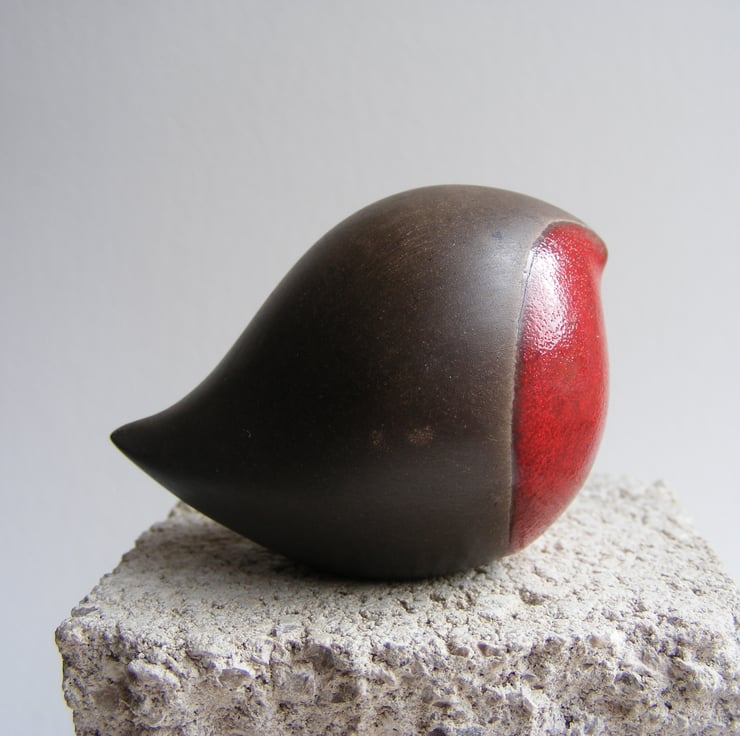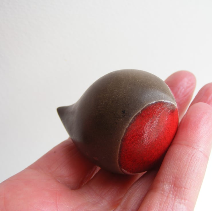This little robin is hand made and measures, 3.8cm high and 5.4cm long. It is made from white earthenware clay and fired first in an electric kiln then the red glaze is painted on and it is raku fired in a gas kiln, the black part of the bird is unglazed and polished with beeswax.