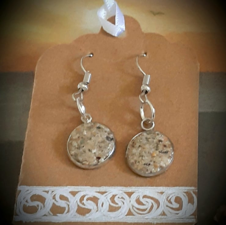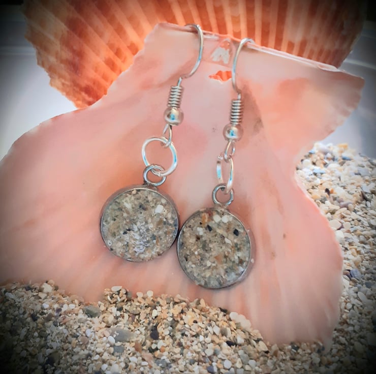 These are a unique pair of handmade sand drop earrings....these are made with sand from Tolcarne beach in Newquay Cornwall....Tolcarne beach known for its watersports ..beach huts and beach hotel . The sand is set and protected in 12mm diameter bezels and attached to silver plated fish hook earrings ..these are a pretty and an unusual pair of earrings.