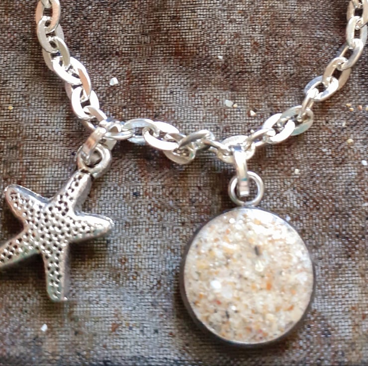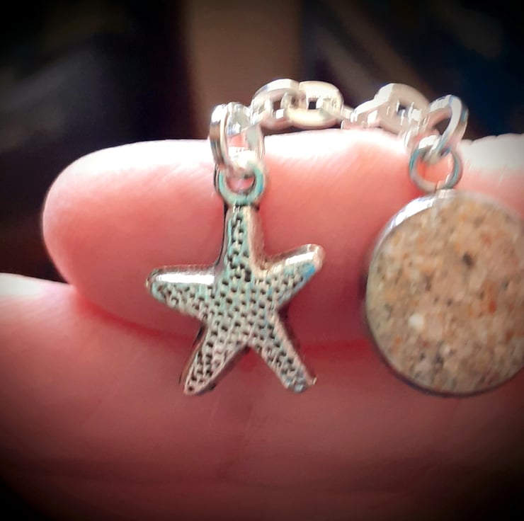 This is a unique anklet as the main charm is made using sand from Watergate Bay Newquay Cornwall....a popular surfing beach The sand is set in a 12mm diameter bezel and together with a little pretty starfish charm is attached to a silver plated chain .The chain measures approx. 9 and half ins and has a 2ins extender chain so anklet can be adjusted and is fastened by a lobster and claw clasp