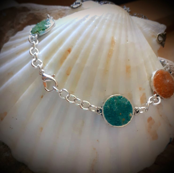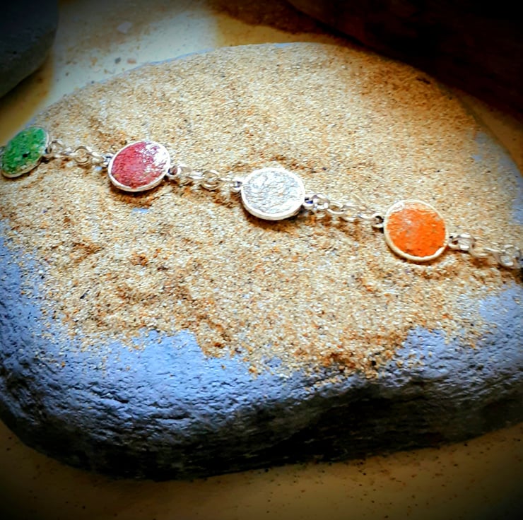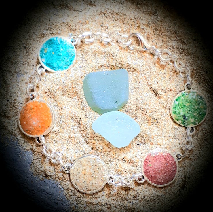 This is a very unusual bezel charm bracelet ...consisting if 5 bezels each bezel which measures 12mm diameter is filled with a different colour sand ...which I have personally coloured . the sand is from Watergate Bay near Newquay Cornwall ...it a very popular destination for surfers and the venue for the annual Boardmasters music festival..The sand is set and protected in each bezel ..it is a very pretty and unique bracelet which is approx.7 and half ins long and fastens with a lobster and claw clasp